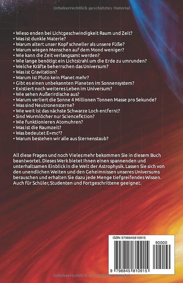 All diese Fragen und noch Vieles mehr bekommen Sie in diesem Buch beantwortet. Dieses Werk bietet Ihnen einen spannenden und unterhaltsamen Einblick in die Welt der Astrophysik. Lassen Sie sich von den unendlichen Weiten und den Geheimnissen unseres Universum berauschen und erhalten Sie dazu jede Menge tiefgreifendes Wissen. Auch für Schüler, Studenten und Fortgeschrittene geeignet. Dieses Buch eignet sich zudem hervorragend als Geschenk.