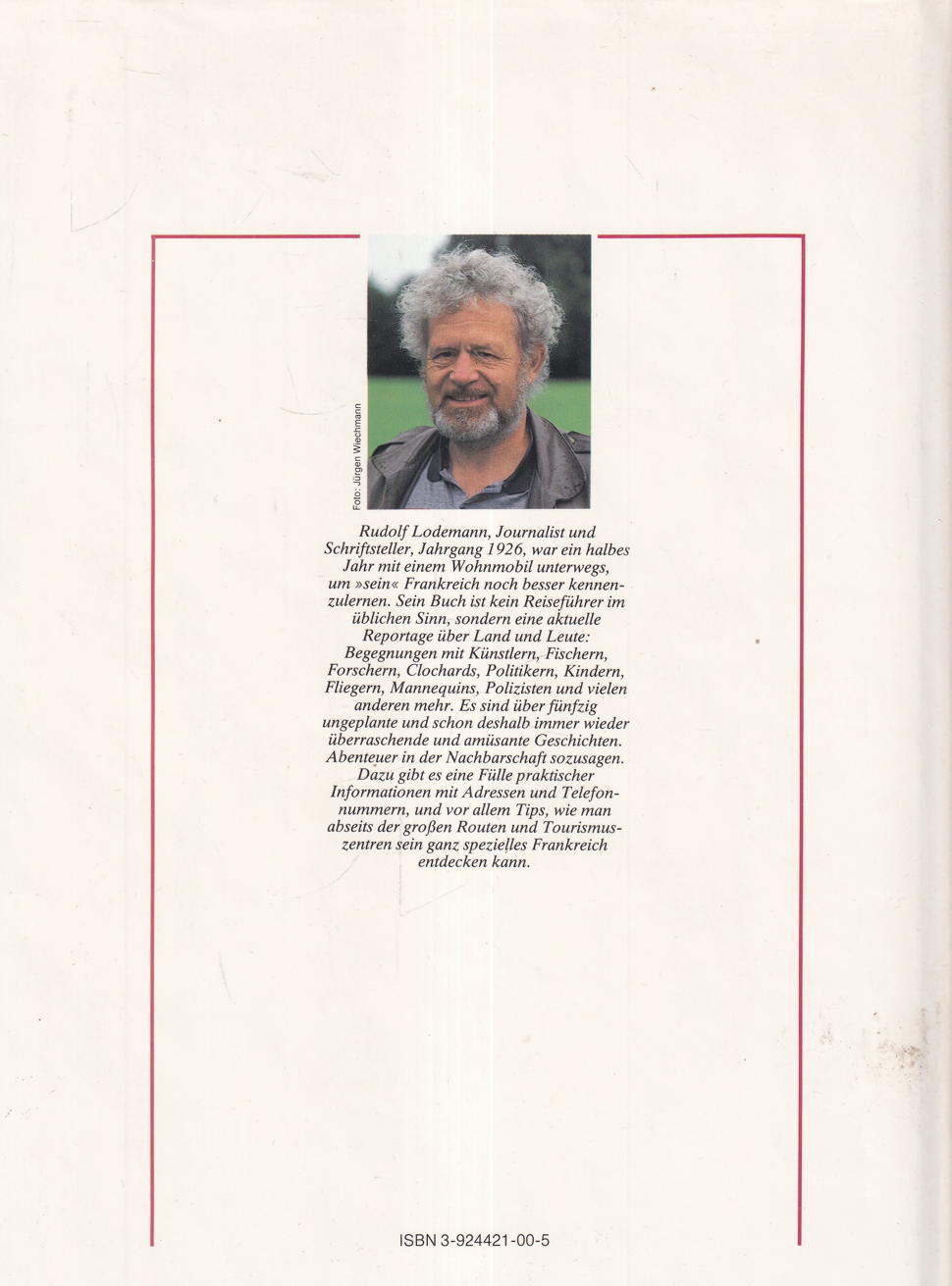 Rudolf Lodemann, Journalist und Schriftsteller, Jahrgang 1926, war ein halbes Jahr mit einem Wohnmobil unterwegs, um »sein« Frankreich noch besser kennenzulernen. Sein Buch ist kein Reiseführer im üblichen Sinn, sondern eine aktuelle Reportage über Land und Leute: Begegnungen mit Künstlern, Fischern, Forschern, Clochards, Politikern, Kindern, Fliegern, Mannequins, Polizisten und vielen anderen mehr. Es sind über fünfzig ungeplante und schon deshalb immer wieder überraschende und amüsante Geschichten.