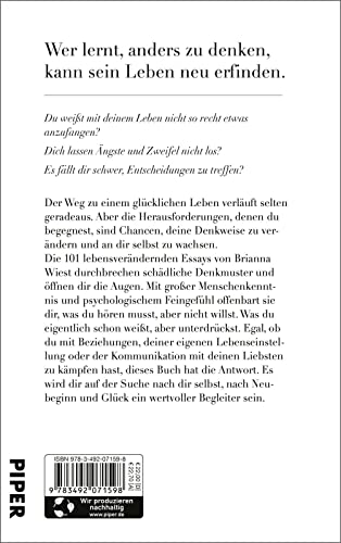 Der Weg zu einem glücklichen und erfüllten Leben verläuft selten geradeaus. Im Gegenteil – überraschenderweise führen uns Ängste, Probleme und Gewohnheiten, die wir am liebsten sofort aus unserem Leben verbannen würden, zum Glück. Diese Hürden und Hindernisse bringen uns zum Denken, lassen uns kreativ nach Lösungen suchen und so an uns selbst wachsen. Durch ihre einfühlsame Art des Schreibens, ihr Wissen aus der Psychologie und ihre philosophische Weitsicht öffnet uns Brianna Wiest die Augen.