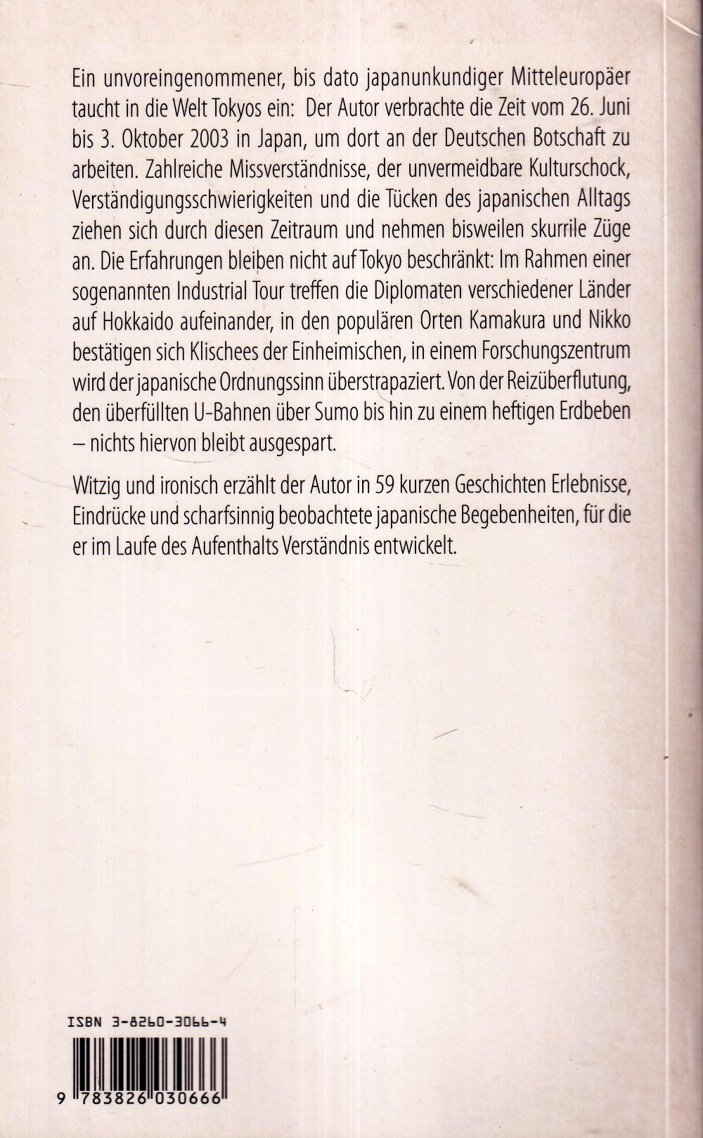 Ein unvoreingenommener, japanunkundiger Mitteleuropäer taucht in die Welt Tokyos ein: Der Autor verbrachte die Zeit vom 26.06.2003 bis 03.10.2003 in Japan, um dort an der Deutschen Botschaft zu arbeiten. Zahlreiche Missverständnisse, der unvermeidbare Kulturschock, Verständigungsschwierigkeiten und die Tücken des japanischen Alltags ziehen sich durch diesen Zeitraum und nehmen bisweilen skurrile Züge an. Die Erfahrungen bleiben nicht auf Tokyo beschränkt: Im Rahmen einer sogenannten Indu-strial Tour treffen die Diplomaten verschiedener Länder auf Hokkaido aufeinander, in den populären Orten Kamakura und Nikko bestätigen sich Klischees der Einheimischen, in einem Forschungszentrum wird der japanische Ordnungssinn überstrapaziert. Von der Reizüberflutung, den überfüllten U-Bahnen über Sumo bis hin zu einem heftigen Erdbeben - nichts hiervon bleibt ausgespart. Witzig und ironisch erzählt der Autor in 59 kurzen Geschichten Erlebnisse, Eindrücke und scharfsinnig beobachtete japanische Begebenheiten, für die er im Laufe des Aufenthalts Verständnis entwickelt.