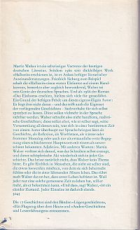 Ein Grund der heftigen Fehde um diesen eigenwilligen Autor: Es liegt ihm nicht daran - und das trifft auch die Eigenart der vorliegenden Geschichten Sachverhalte für sich selbst sprechen zu lassen. Diese sollen vielmehr in der Sprache sichtbar werden. Walser schreibt also nicht handfeste, realistische Geschichten ; diese sollen eher, wie er selber sagt, «eine Versammlung all dessen sein, was sich in einer bestimmten Zeit von einem Autor überhaupt zur Sprache bringen lässt als Geschichte, als Reflexion, als Wortfetzen, als wüster oder frommer Monolog oder auch nur als erstaunliche erste Begegnung eines schüchternen Hauptworts mit einem als unverschämt bekannten Adjektiv». Mit anderen Worten : Martin Walser verlässt sich darauf, was das Schreiben selbst erzeugt, und dieser schöpferische Akt wiederholt sich in jeder Geschichte. Das heisst natürlich nicht, dass Walser kein Thema hätte. Er gibt Einblick in Menschen, die nicht sie selber sind, die etwas loswerden möchten, von dem sie sich beherrscht fühlen oder die in einer lähmenden Misere leben. Das rührt nach Walser davon her, dass unser Leben befristet ist. Weil jeder nur eine solche gemessene Zeit zu leben hat, will er mehr, als er bekommen kann. «Und das», sagt Walser, «ist ein elender Zustand. Jeder Einzelne ist dadurch elend».