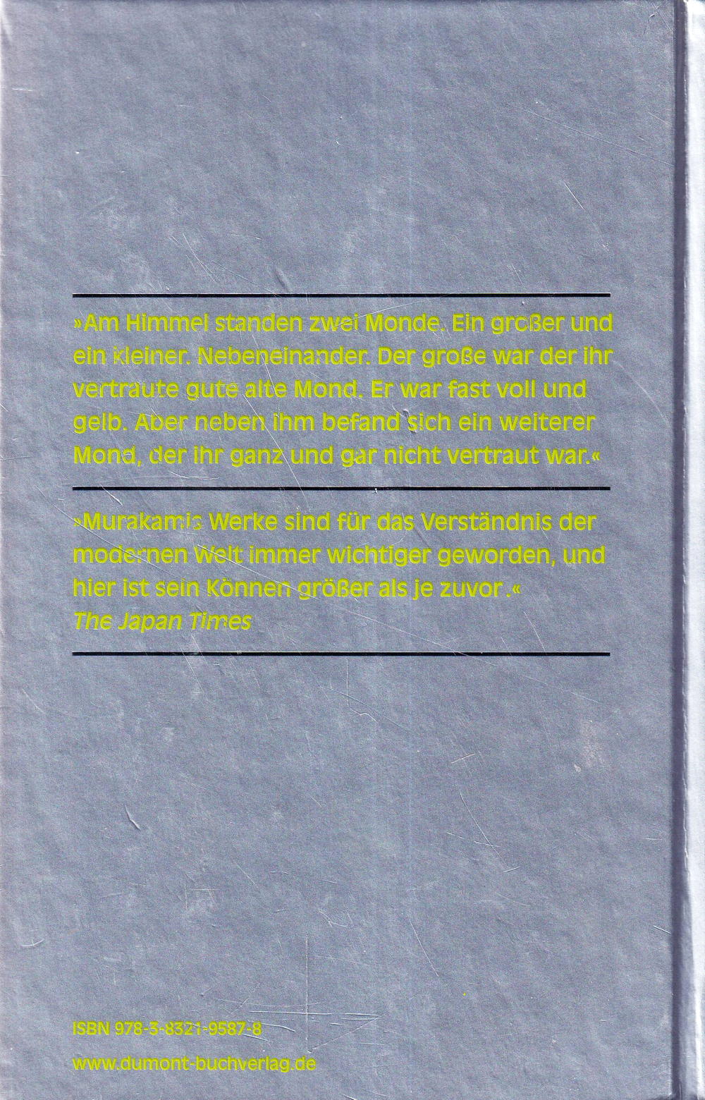 1984. Aomame hat zwei verschieden grosse Ohren. Beim Rendezvous mit einem reichen Ölhändler zückt sie eine Nadel und ersticht ihn. Ein Auftragsmord, um altes Unrecht zu sühnen. Tengo ist Hobby-Schriftsteller. Er soll einen Roman der exzentrischen 17-jährigen Fukaeri überarbeiten, damit sie einen Literaturpreis bekommt. Der Text ist äusserst originell, aber schlecht geschrieben, ein riskanter Auftrag. Aomame wundert sich, warum die Nachrichten ihren Mord nicht melden. Ist sie in eine Parallelwelt geraten? Um diese Sphäre vom gewöhnlichen Leben im Jahr 1984 zu unterscheiden, gibt Aomame der neuen, unheimlichen Welt den Namen 1Q84.
