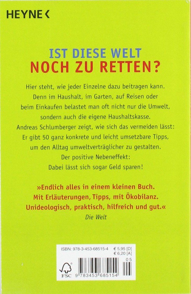 Ist diese Welt noch zu retten? Hier steht, wie jeder Einzelne dazu beitragen kann. Ob im Haushalt, im Garten, auf Reisen oder beim Einkaufen: Andreas Schlumberger hat 50 ganz konkrete und leicht umsetzbare Tipps für den Alltag parat, die helfen, die Natur zu schützen, natürliche Ressourcen zu erhalten, und die als positiver Nebeneffekt auch noch die Haushaltskasse entlasten.