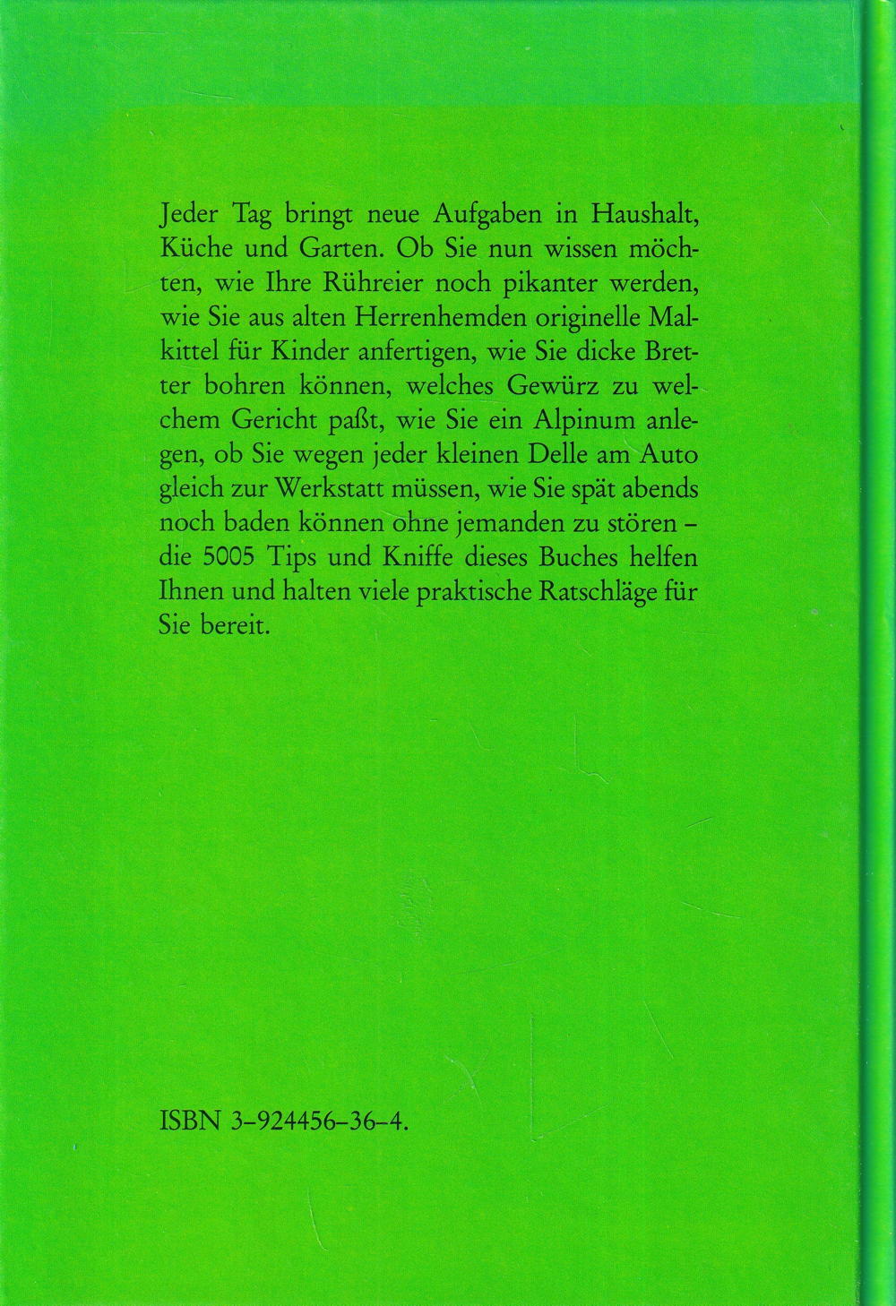 Jeder Tag bringt neue Aufgaben in Haushalt, Küche und Garten. Ob Sie nun wissen möchten, wie Ihre Rühreier noch pikanter werden, wie Sie aus alten Herrenhemden originelle Malkittel für Kinder anfertigen, wie Sie dicke Bretter bohren können, welches Gewürz zu welchem Gericht passt, wie Sie ein Alpinum anlegen, ob Sie wegen jeder kleinen Delle am Auto gleich zur Werkstatt müssen, wie Sie spät abends noch baden können ohne jemanden zu stören die 5005 Tips und Kniffe dieses Buches helfen Ihnen und halten viele praktische Ratschläge für Sie bereit.