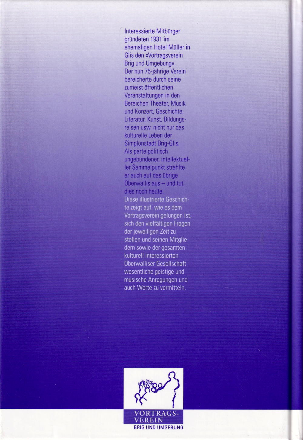 Diese illustrierte Geschichte zeigt auf, wie es dem Vortragsverein gelungen ist, sich den vielfältigen Fragen der jeweiligen Zeit zu stellen und seinen Mitgliedern sowie der gesamten kulturell interessierten Oberwalliser Gesellschaft wesentliche geistige und musische Anregungen und auch Werte zu vermitteln.