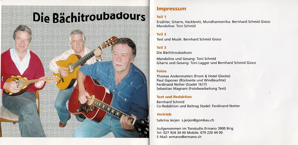 Walliser Sagen, Musik und Lieder mit Volkston unter anderem mit den Bächitroubadours.