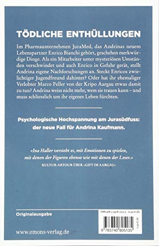 Im Pharmaunternehmen JuraMed, das Andrinas neuem Lebenspartner Enrico Bianchi gehört, geschehen merkwürdige Dinge. Als ein Mitarbeiter unter mysteriösen Umständen verschwindet und auch Enrico in Gefahr gerät, stellt Andrina eigene Nachforschungen an. Steckt Enricos zwielichtiger Jugendfreund dahinter? Oder hat ihr ehemaliger Verlobter Marco Feller von der Kripo Aargau etwas damit zu tun? Andrina weiss nicht mehr, wem sie trauen kann – und muss schliesslich um ihr eigenes Leben fürchten.