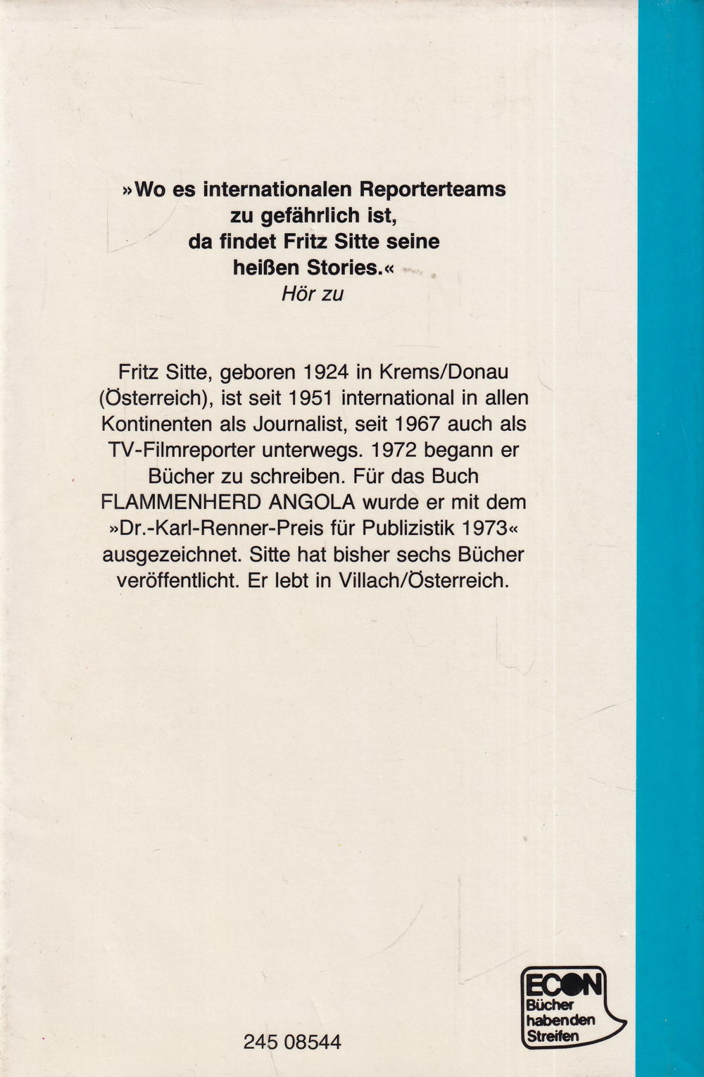 Fritz Sitte, geboren 1924 in Krems/Donau (Österreich), ist seit 1951 international in allen Kontinenten als Journalist, seit 1967 auch als TV-Filmreporter unterwegs. 1972 begann er Bücher zu schreiben. Für das Buch FLAMMENHERD ANGOLA wurde er mit dem »Dr. -Karl-Renner-Preis für Publizistik 1973« ausgezeichnet. Sitte hat bisher sechs Bücher veröffentlicht. Er lebt in Villach/Österreich.