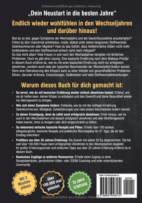 Hast du schon versucht in der Menopause abzunehmen und festgestellt, dein Stoffwechsel ist langsam, kein Gramm geht runter und du Angst hast, es nie mehr zu schaffen? Kämpfst Du mit unerwünschtem Bauchfett, Gelenkschmerzen, fühlst dich resigniert und kraftlos? Wenn du leicht abnehmen willst und z. B. an Arthrose leidest, dann findest du Lösungsansätze, die bereits tausenden von Frauen geholfen haben! Über 35 Jahre Erfahrung liegen diesem Experten-Ratgeber zugrunde. Du lernst, wie du durch basische Ernährung & entzündungshemmende Ernährung bis ins hohe Alter Übersäuerung abbauen kannst. Tausendfache Erfolge zeigen: „Die Wahrheit ist, du kannst sehr erfolgreich in und nach der Menopause abnehmen und die Gesundheit zurückerobern. Deine Veränderung in den Wechseljahren: Abnehmen und Wohlfühlen, die Gesundheit durch basische & entzündungshemmende Ernährung zurückerobern und viele Beschwerden verlieren oder mildern. Ernährungspläne, basische Rezepte und erprobte Hilfen aus der Erfahrung von über 100 Tsd. Frauen geben dir Unterstützung, wie du auch mit über 50 abnehmen und durch richtiges Essen Schmerzen, Bluthochdruck, Gicht und Arthrose gleichzeitig verbessern kannst. Wovon du profitierst, wenn du dieses Buch liest: Wohlbefinden im eigenen Körper: Du findest eine einfache Schritt für Schritt Anleitung, um im individuellen, oft auch stressigen Alltag trotz Menopause abzunehmen, zu erleben wie du Energie, Freude & deine Vitalität zurückgewinnen kannst Lerne, wie du ohne Verzicht alles essen und Übersäuerung in deinem Körper abbauen kannst! Du erfährst, wie du jegliche Lieblingsmahlzeit mit basischer Ernährung kombinieren kannst und so bleibend & erfolgreich abnehmen wirst Langfristig ohne JoJo Effekt und schmerzfrei leben können: Das gelingt, wenn du lecker und ohne Verzicht essen kannst, weil dir das Abnehmen leicht fällt Du erkennst, wie Fettverbrennung und auch das Abnehmen am Bauch in oder nach den Wechseljahren wieder funktioniert Endlich Übersäuerung durch Basenfasten (nur in der ersten Woche) mit grosszügigen und satt machenden basischen Rezepten abbauen. Danach lernst du, wie du täglich auch Pasta, Kuchen, oder Fleischgerichte mit dem 2/3 Prinzip geniessen kannst Gelenkschmerzen, gefährlichem Bauchfett, Müdigkeit, Arthrose, einem langsamen Stoffwechsel u. v. m endlich den Kampf ansagen! Du lernst, dass Essen gegen Schmerzen helfen und dabei auch lecker und familientauglich sein kann. Über die Autorin: Marion Pisani ist eine inspirierende Expertin und mehrfache Buchautorin für Ernährungsberatung. Als selbst Betroffene hat sie es sich zur Mission gemacht, Frauen auf ihrem Weg zum Wohlfühlgewicht durch die Wechseljahre zu unterstützen. Ihre Methoden basieren seit 1989 auf jahrzehntelanger Erfahrung von tausenden Frauen und dem Wissen, dass eine gesunde Ernährung und basische Ernährung der Schlüssel zu einem erfüllten und energiegeladenen Leben ist. Sie ist Spezialistin, Frauen bis ins hohe Lebensalter erfolgreich zu ihrem gesunden Gewicht und zu neuer Lebensfreude zu verhelfen. Ziel dieses Buches ist: Erlebe, wie du in Wechseljahren erfolgreich abnehmen und gesund werden kannst! Wie du deine Lebensenergie bis ins hohe Alter zurückgewinnen kannst, um die Herausforderungen der Wechseljahre zu überwinden. Starte jetzt, die nächsten Jahre deines Lebens wie tausende Frauen vor dir, um diese zu deiner glücklichsten Lebenszeit zu machen. Buchinhalt: Schritt für Schritt Anleitungen Das Verständnis von Säure Basenhaushalt & antientzündlicher Ernährung Warum essen gegen Schmerzen dir helfen kann Essen im stressigen Alltag Familienessen 3 Wochen Ernährungsplan + 100 Rezepte Vorschläge für Frühstück, Mittag- und Abendessen Süsses und basisches Backen uvm.