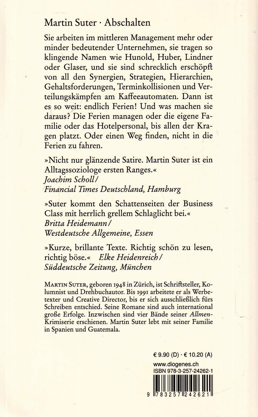 Martin Suter, geboren 1948 in Zürich, lebt mit seiner Frau in Spanien und Guatemala. Er war Werbetexter und erfolgreicher Werber, ein Beruf, den er immer wieder durch andere Schreibtätigkeiten ergänzt oder unterbrochen hat. Unter anderem "GEO"-Reportagen, zahlreiche Drehbücher für Film und Fernsehen. Seit 1991 lebt er als freier Autor, seit 1992 schreibt er die wöchentliche Kolumne "Business Class" in der "Weltwoche".§§Martin Suter ist am 29. März 2004 in Zürich mit der Goldenen Diogenes Eule ausgezeichnet worden.
