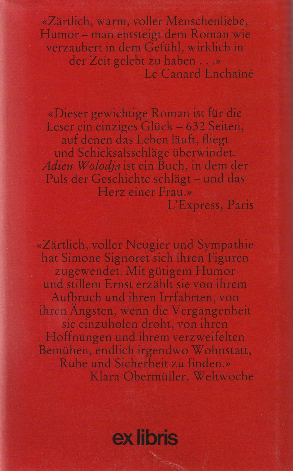 «Zärtlich, voller Neugier und Sympathie hat Simone Signoret sich ihren Figuren zugewendet. Mit gütigem Humor und stillem Ernst erzählt sie von ihrem Aufbruch und ihren Irrfahrten, ihren Ängsten, wenn die Vergangenheit sie einzuholen droht, von ihren Hoffnungen und ihrem verzweifelten Bemühen, endlich irgendwo Wohnstatt, Ruhe und Sicherheit zu finden. »