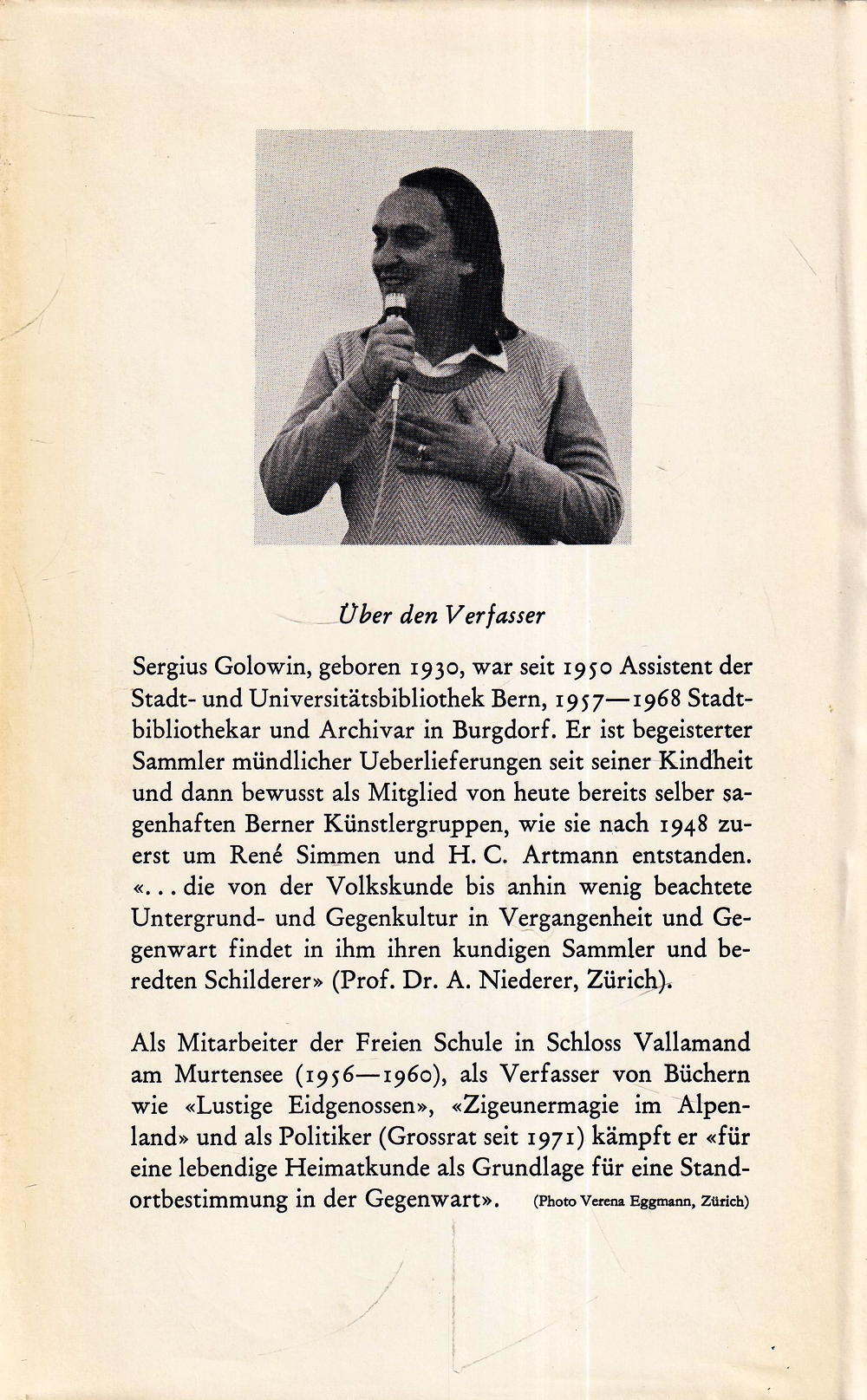 Sergius Golowin, geboren 1930, war seit 1950 Assistent der Stadt- und Universitätsbibliothek Bern, 1957-1968 Stadtbibliothekar und Archivar in Burgdorf. Er ist begeisterter Sammler mündlicher Ueberlieferungen seit seiner Kindheit und dann bewusst als Mitglied von heute bereits selber sagenhaften Berner Künstlergruppen, wie sie nach 1948 zuerst um René Simmen und H. C. Artmann entstanden.