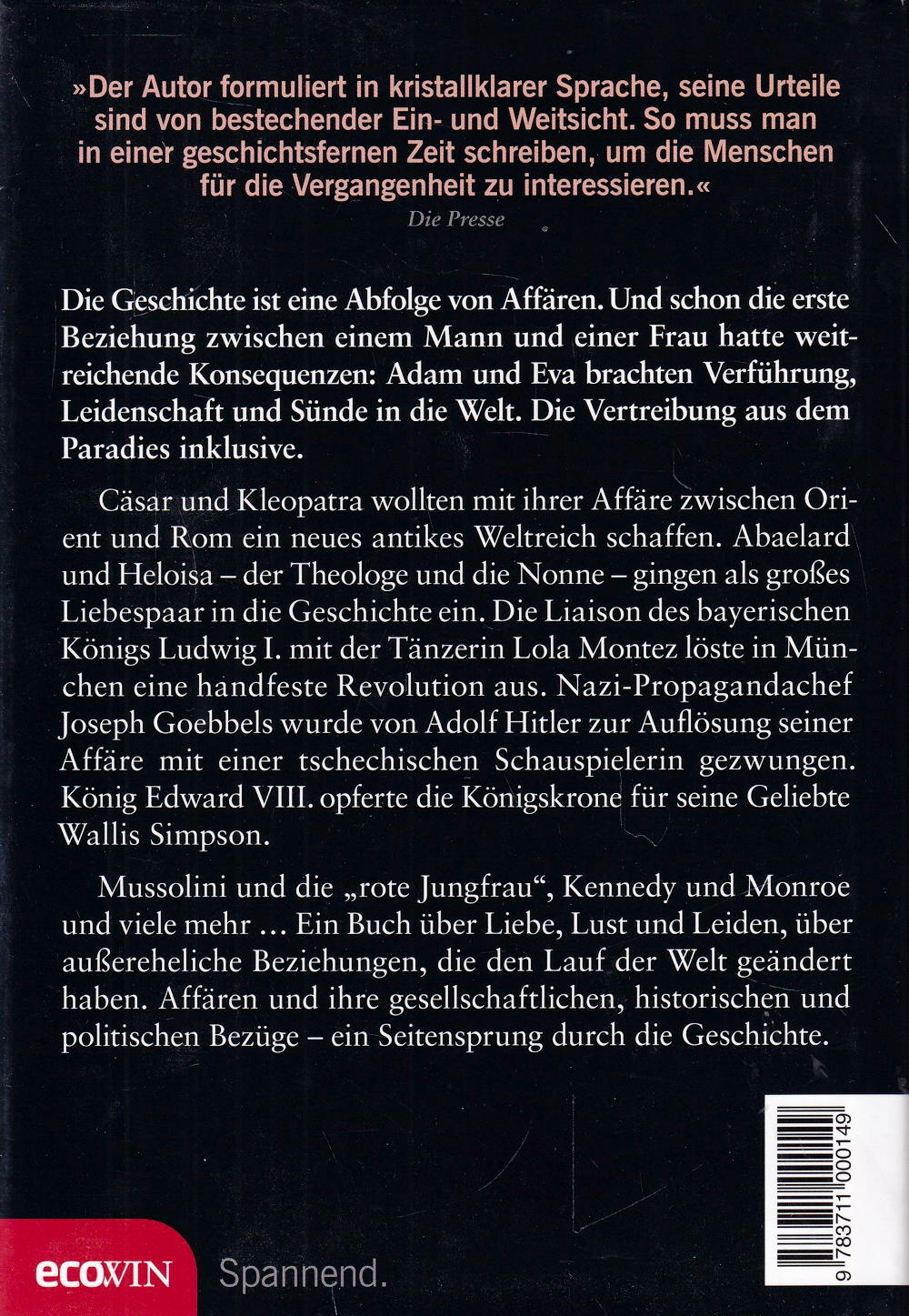 Die Geschichte ist eine Abfolge von Affären. Und schon die erste Beziehung zwischen einem Mann und einer Frau hatte weitreichende Konsequenzen: Adam und Eva brachten Verführung, Leidenschaft und Sünde in die Welt. Die Vertreibung aus dem Paradies inklusive. Wäre Geschichte, wären Mythen, Künste ohne Leidenschaft und ohne Leiden denkbar? Wie stark und mächtig ist ein Gefühl, das den Verstand ausschaltet, die Vorsicht ausser Kraft setzt, das Königskronen aufs Spiel setzt und für Momente der Lust den Tod riskiert? Cäsar und Cleopatra wollten mit ihrer Affäre zwischen Orient und Rom ein neues antikes Weltreich schaffen. Abälard und Heloise. Die Nonne und der Theologe gingen als grosses Liebespaar in die Geschichte ein. Elizabeth I., "jungfräuliche" Königin von England, steht gar in Verdacht die Ehefrau ihres Geliebten ermordet zu haben. Nazi-Propagandachef Joseph Goebbels wurde von Adolf Hitler zur Auflösung seiner Affäre mit einer tschechischen Schauspielerin gezwungen. über die sexuellen Eskapaden des britischen Ministers Profumo stolperte Londons Regierung. Ein Buch über aussereheliche Beziehungen, die Geschichte gemacht haben: Affären und ihre gesellschaftlichen, historischen und politischen Bezüge. Affären, die Geschichte - und Geschichten- machten.