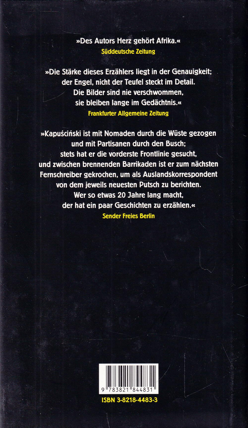 Immer wieder zieht es den polnischen Journalisten Ryszard Kapuscinski nach Afrika, zu den Schauplätzen von Staatsgründungen, Putschen und Bürgerkriegen. Mehr als vierzig Jahre hat er den "Schwarzen Kontinent" bereist, seine Menschen erforscht und in seinen Reportagen beschrieben. Die Summe seiner Neugier, seiner Erfahrungen, seiner Faszination und seines ohnmächtigen Staunens über die gewaltigen Dimensionen Afrikas geben ein hautnahes Bild.