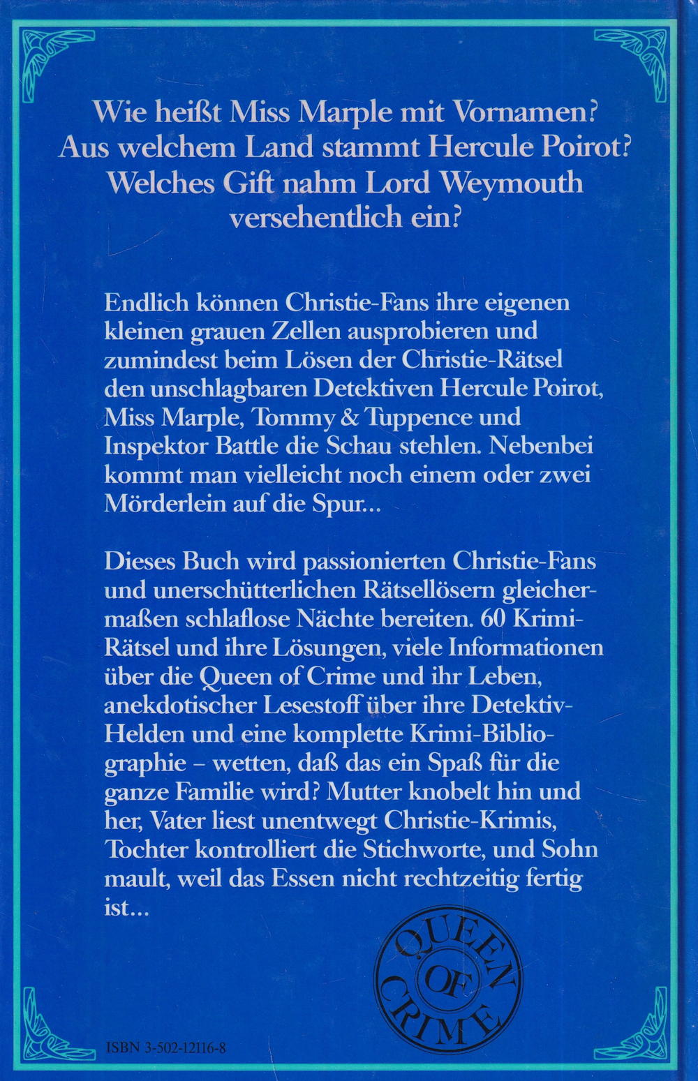 Dieses Buch wird passionierten Christie-Fans und unerschütterlichen Rätsellösern gleichermassen schlaflose Nächte bereiten. 60 Krimi-Rätsel und ihre Lösungen, viele Informationen über die Queen of Crime und ihr Leben, anekdotischer Lesestoff über ihre Detektiv-Helden und eine komplette Krimi-Bibliographie - wetten, dass das ein Spass für die ganze Familie wird? Mutter knobelt hin und her, Vater liest unentwegt Christie-Krimis, Tochter kontrolliert die Stichworte, und Sohn mault, weil das Essen nicht rechtzeitig fertig ist...