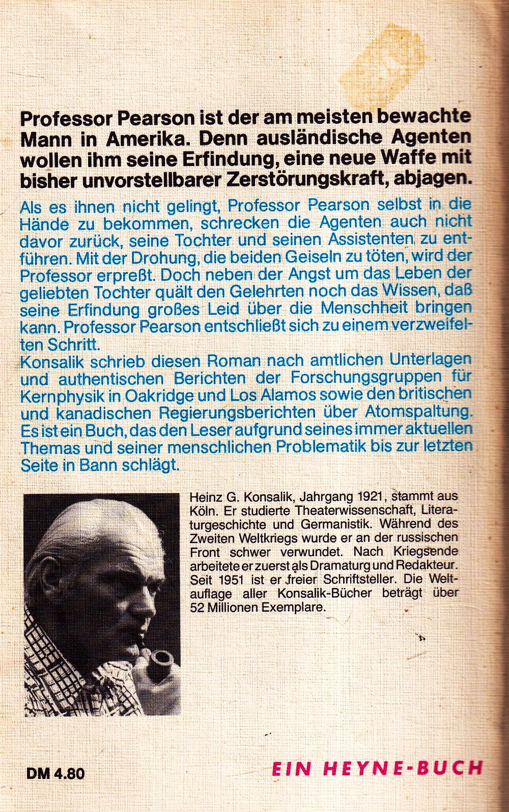 Konsalik schrieb diesen Roman nach amtlichen Unterlagen und authentischen Berichten der Forschungsgruppen für Kernphysik in Oakridge und Los Alamos sowie den britischen und kanadischen Regierungsberichten über Atomspaltung.