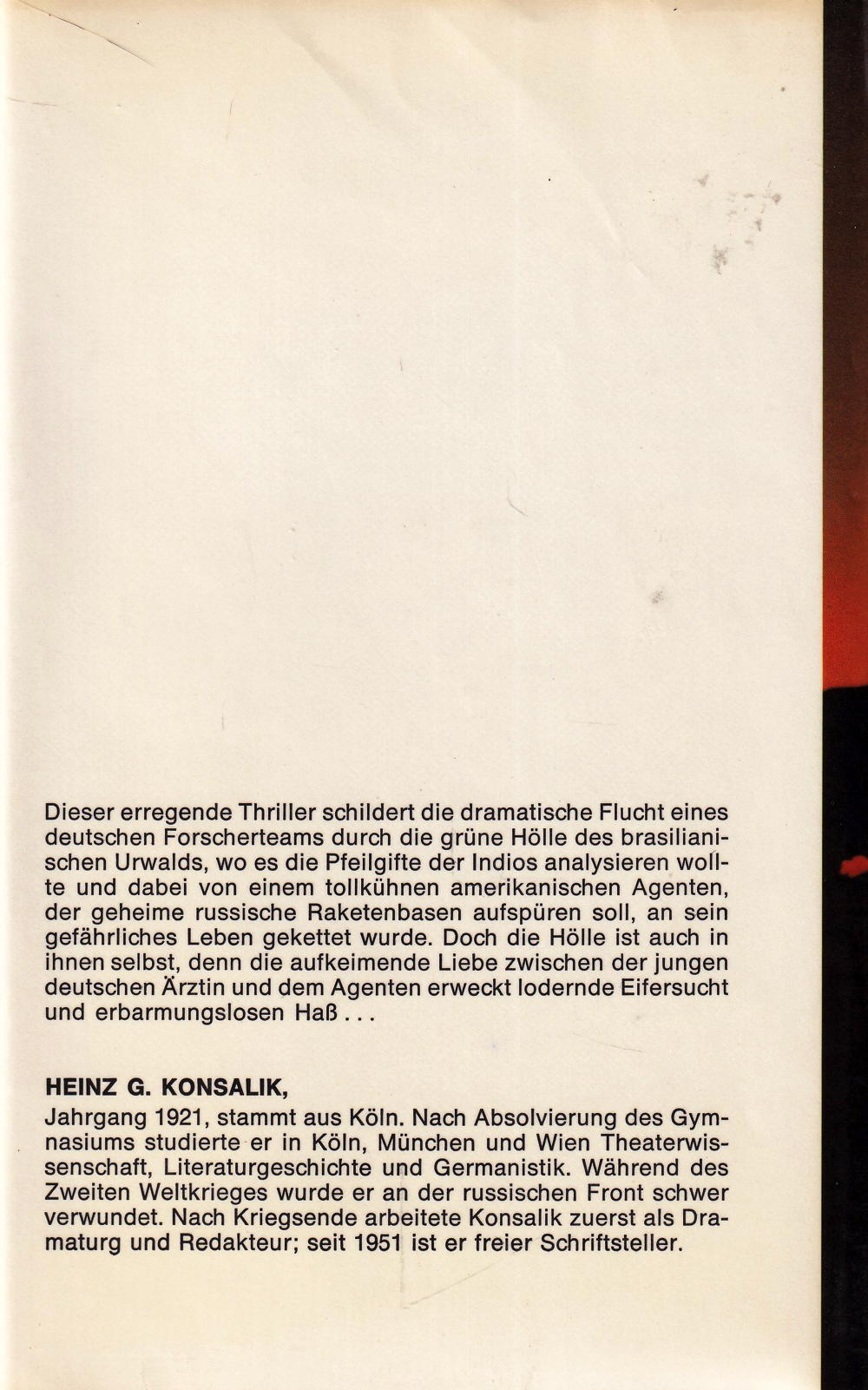 Dieser erregende Thriller schildert die dramatische Flucht eines deutschen Forscherteams durch die grüne Hölle des brasilianischen Urwalds, wo es die Pfeilgifte der Indios analysieren wollte und dabei von einem tollkühnen amerikanischen Agenten, der geheime russische Raketenbasen aufspüren soll, an sein gefährliches Leben gekettet wurde. Doch die Hölle ist auch in ihnen selbst, denn die aufkeimende Liebe zwischen der jungen deutschen Ärztin und dem Agenten erweckt lodernde Eifersucht und erbarmungslosen Hass...