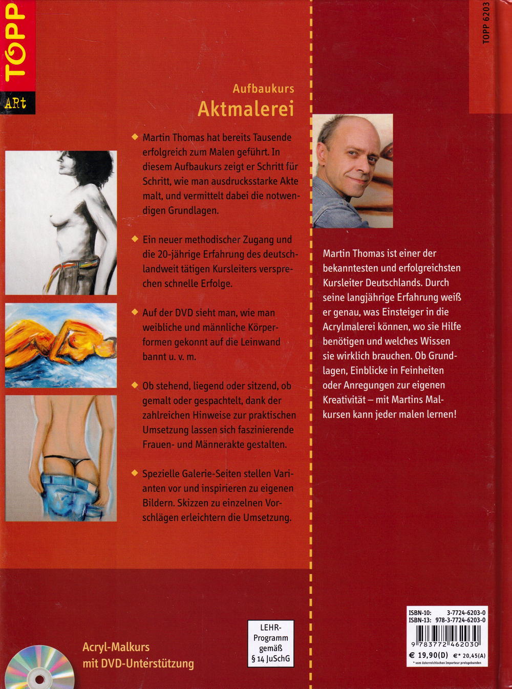 In diesem Aufbaukurs zeigt Martin Thomas Schritt für Schritt, wie man ausdrucksstarke Akte malt und vermittelt dabei die notwendigen Grundlagen. Ein neuer methodischer Zugang verspricht schnelle Erfolge. Ob stehend, liegend oder sitzend, ob gemalt oder gespachtelt, dank der zahlreichen Hinweise zur praktischen Umsetzung lassen sich faszinierende Frauen- und Männerakte gestalten. Die DVD unterstützt den Lerneffekt des Buches, da man genau sieht, wie weibliche und männliche Körperformen gekonnt auf die Leinwand gebannt werden.