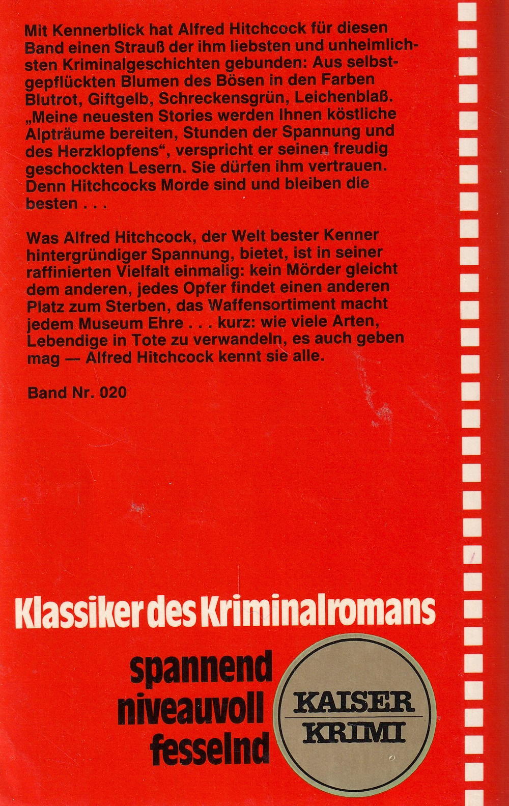 Was Alfred Hitchcock, der Welt bester Kenner hintergründiger Spannung, bietet, ist in seiner raffinierten Vielfalt einmalig: kein Mörder gleicht dem anderen, jedes Opfer findet einen anderen Platz zum Sterben, das Waffensortiment macht jedem Museum Ehre... Kurz: wie viele Arten, Lebendige in Tote zu verwandeln, es auch geben mag -Alfred Hitchcock kennt sie alle.