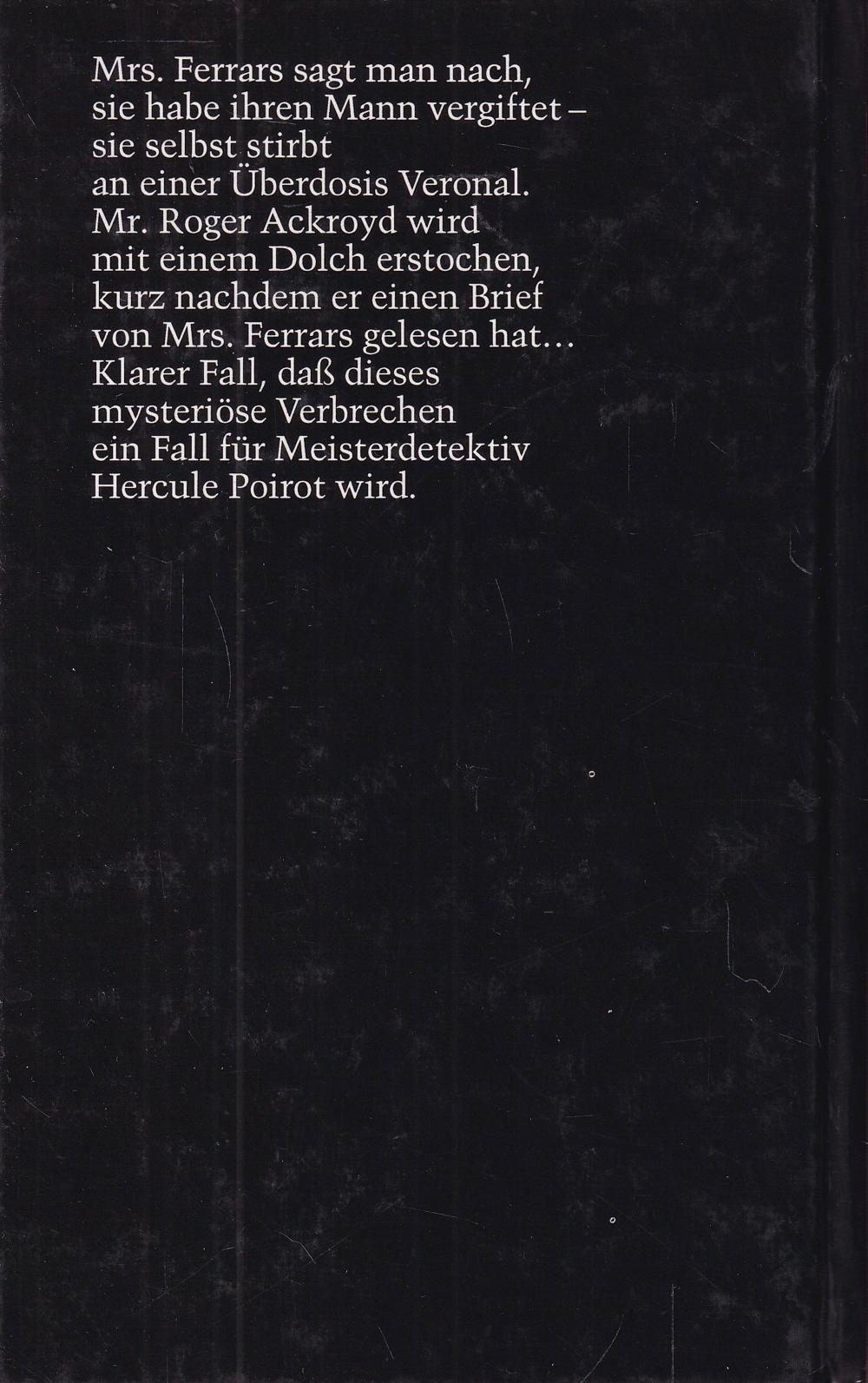 Mrs. Ferrars sagt man nach, sie habe ihren Mann vergiftet – sie selbst stirbt an einer Überdosis Veronal. Mr. Roger Ackroyd wird mit einem Dolch erstochen, kurz nachdem er einen Brief von Mrs. Ferrars gelesen hat... Klarer Fall, dass dieses mysteriöse Verbrechen ein Fall für Meisterdetektiv Hercule Poirot wird.