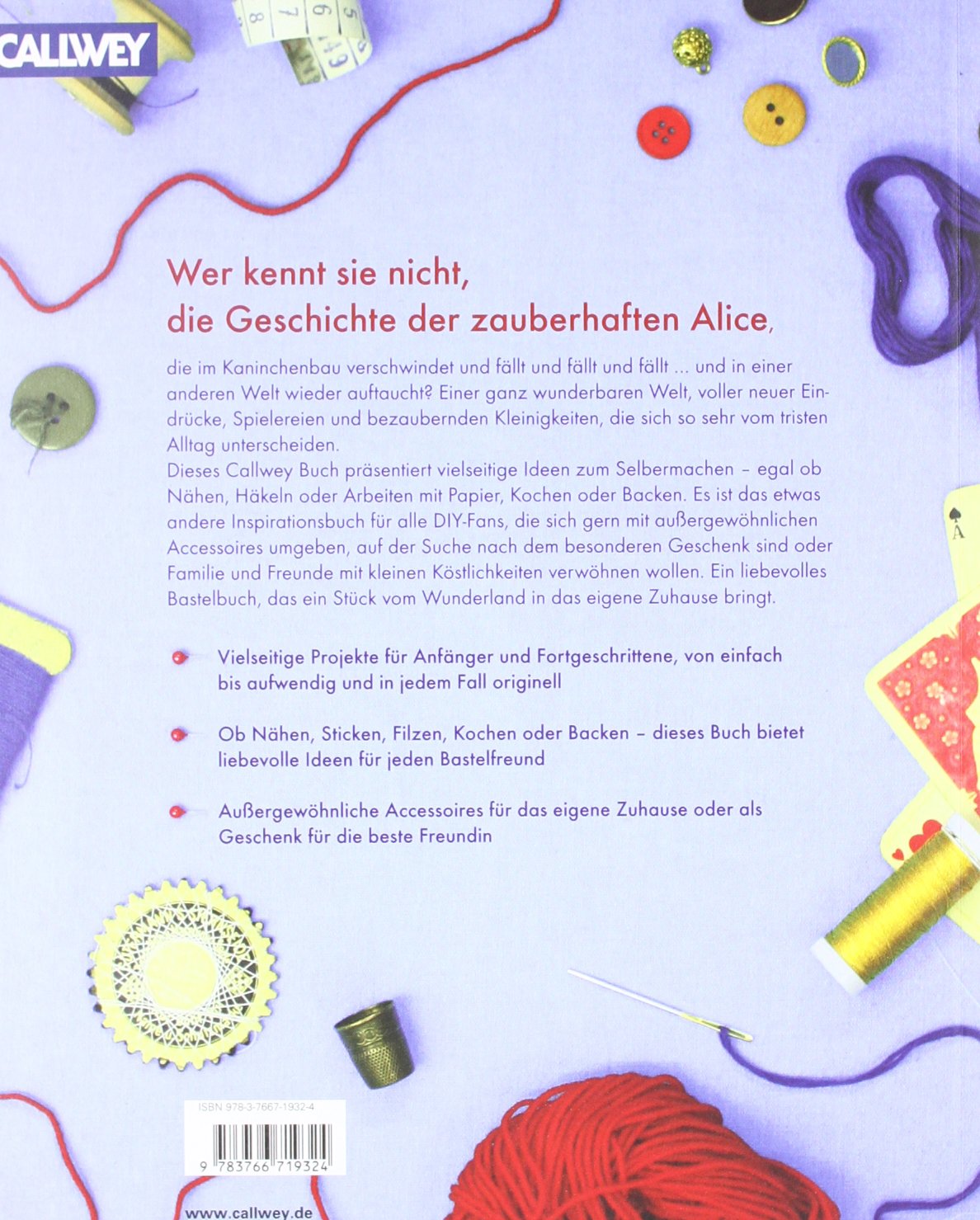 Ein liebevolles Bastelbuch voller besonderer Ideen, das ein Stück von Alice Wunderland in das eigene Zuhause bringt. Sie fasziniert immer wieder, die Geschichte der zauberhaften Alice, die im Kaninchenbau verschwindet und fällt und fällt und fällt und in einer anderen Welt wieder auftaucht. Einer wunderbaren Welt, voller neuer Eindrücke, Spielereien und bezaubernder Kleinigkeiten, die sich so sehr vom tristen Alltag unterscheiden. Dieses Buch präsentiert vielseitige Ideen zum Selbermachen ob Nähen, Häkeln oder Arbeiten mit Papier, Kochen oder Backen hier wird auf verschiedenste Art gebastelt. Es ist das etwas andere Inspirationsbuch für alle Do-it-yourself-Fans, die sich gern mit außergewöhnlichen Accessoires umgeben, auf der Suche nach dem besonderen Geschenk sind oder um Familie und Freunde mit kleinen Köstlichkeiten zu verwöhnen.