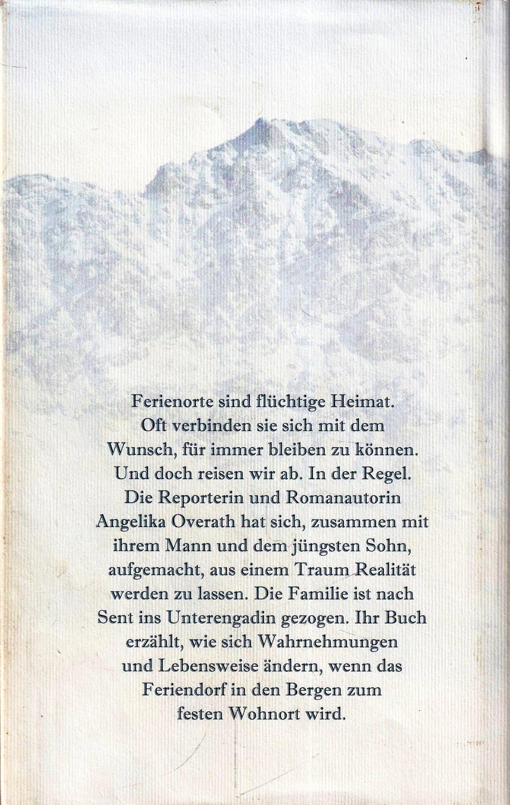 Ferienorte sind flüchtige Heimat. Oft verbinden sie sich mit dem Wunsch für immer bleiben zu können. Und doch reisen wir ab. In der Regel. Die Reporterin und Romanautorin Angelika Overath hat sich, zusammen mit ihrem Mann und dem jüngsten Sohn aufgemacht, aus einem Traum Realität werden zu lassen. Die Familie ist nach Sent ins Unterengadin gezogen. Ihr Buch erzählt, wie sich Wahrnehmungen und Lebensweise ändern, wenn das Feriendorf in den Bergen zum festen Wohnort wird.