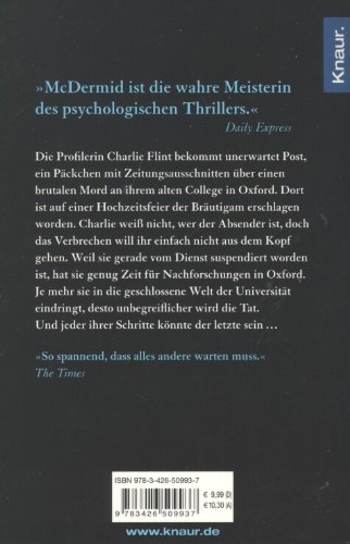 Die Profilerin Charlie Flint bekommt unerwartet Post, ein Päckchen mit Zeitungsausschnitten über einen brutalen Mord an ihrem alten College in Oxford. Dort ist auf einer Hochzeitsfeier der Bräutigam erschlagen worden. Während die Gäste sich den Champagner schmecken liessen, hat man seine blutüberströmte Leiche in den nahen Fluss geworfen. Charlie weiss nicht, wer der Absender ist, doch das Verbrechen will ihr einfach nicht aus dem Kopf gehen. Weil sie gerade vom Dienst suspendiert worden ist, hat sie genug Zeit für Nachforschungen in Oxford. Je mehr sie in die geschlossene Welt der Universität eindringt, desto unbegreiflicher wird die Tat. Und jeder ihrer Schritte könnte einer zu viel sein …