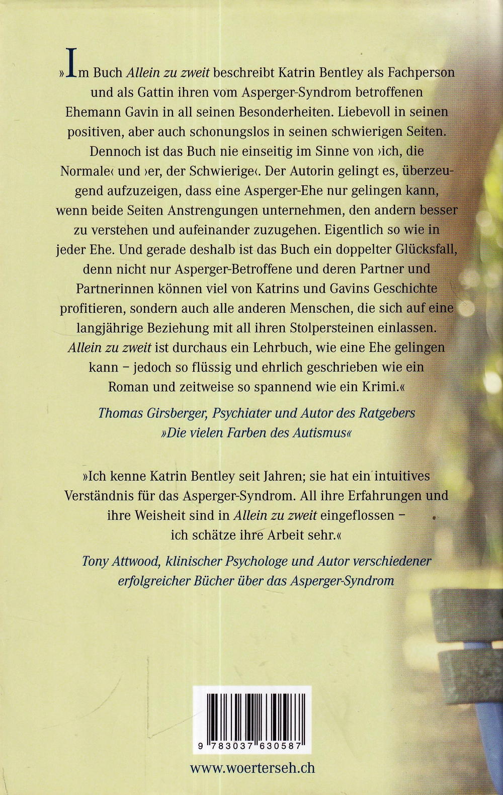 Als Katrin im Januar 1987 nach Australien reiste, ahnte sie nicht, dass sie dort Gavin, die Liebe ihres Lebens, finden würde. Nur wenige Monate später machte er ihr einen Heiratsantrag, den sie bedenkenlos annahm. Für diesen ungewöhnlichen Mann war die 27-jährige Lehrerin gern bereit, ihre Heimat am Thunersee, ihre Familie und ihre Freunde zu verlassen und nach Down Under zu ziehen. Bald schon aber zeigten sich die ersten Schwierigkeiten. Warum, fragte sich Katrin, lässt Gavin sich durch Kleinigkeiten dermassen aus der Ruhe bringen? Warum verhält er sich Gästen gegenüber so taktlos? Warum hat er ein so grosses Bedürfnis, allein zu sein? Warum interessieren ihn die Gefühle anderer nicht? Und vor allem: Warum steht er mir nie zur Seite, wenn es mir nicht gut geht? Die emotionale Unbeholfenheit ihres Mannes machte ihr immer mehr zu schaffen. Mehr als einmal war Katrin, inzwischen Mutter zweier Kinder, der Verzweiflung nahe. Aber aufgeben war für sie keine Option, und so suchte sie nach einer Erklärung für Gavins Verhalten. Siebzehn Jahre nach der Hochzeit war die Diagnose endlich gestellt: Asperger-Syndrom. Katrin begann sich intensiv mit diesem Autismus-Phänomen auseinanderzusetzen, machte eine Ausbildung zur psychologischen Beraterin und eröffnete ihre eigene Praxis, um Menschen mit dem Asperger-Syndrom und deren Partner zu beraten und Ehen retten zu helfen.