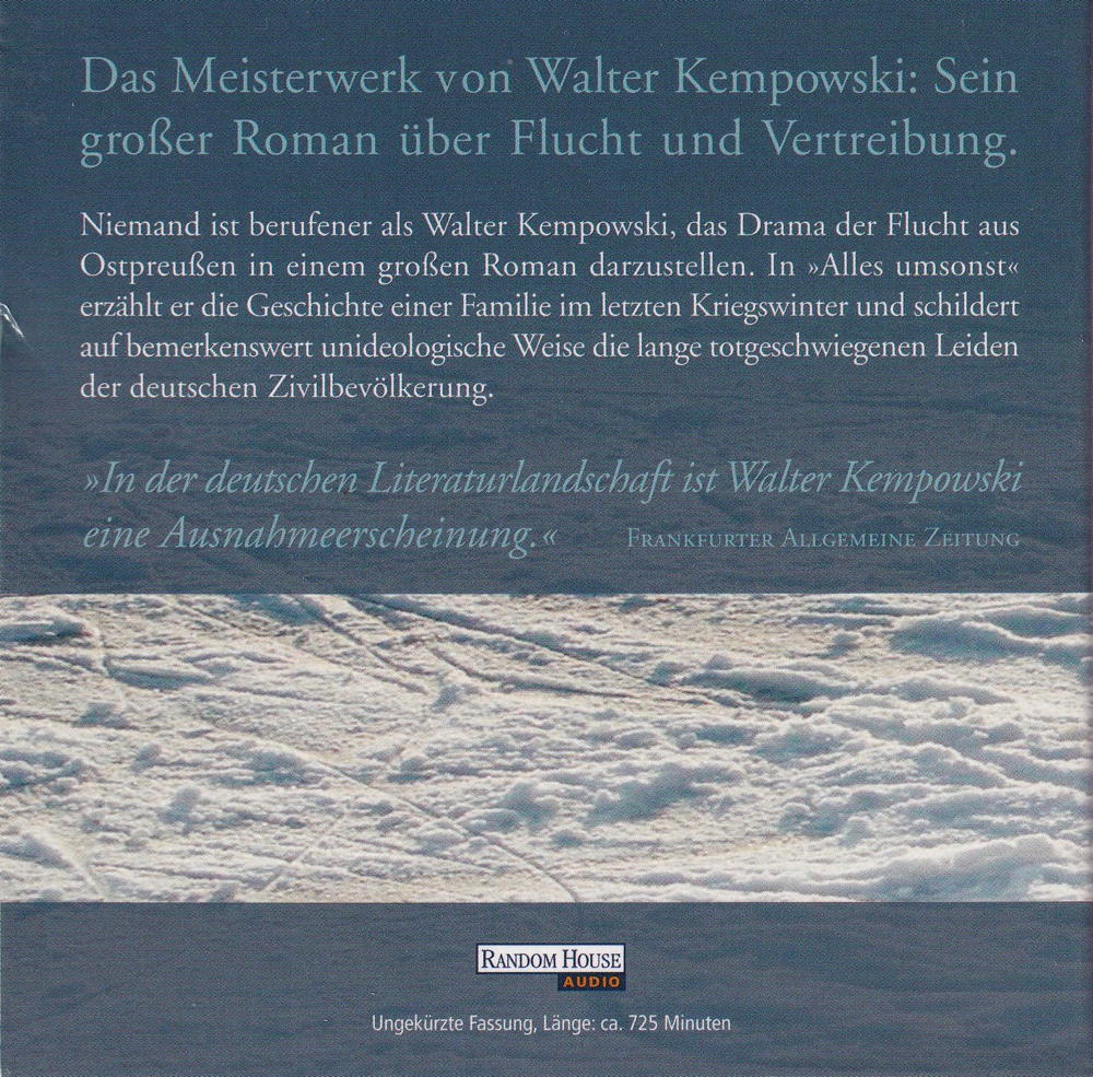 Niemand ist berufener als Walter Kempowski, das Drama der Flucht aus Ostpreussen in einem grossen Roman darzustellen. In »Alles umsonst« erzählt er die Geschichte einer Familie im letzten Kriegswinter und schildert auf bemerkenswert unideologische Weise die lange totgeschwiegenen Leiden der deutschen Zivilbevölkerung.