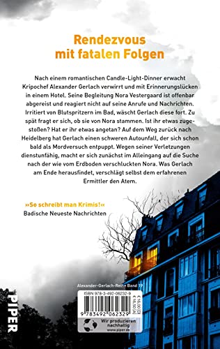 Nach einem romantischen Candle-Light-Dinner erwacht Kripochef Alexander Gerlach verwirrt und mit Erinnerungslücken in einem Hotel. Seine Begleitung Nora Vestergaard ist offenbar abgereist und reagiert nicht auf seine Anrufe und Nachrichten. Irritiert von Blutspritzern im Bad, wäscht Gerlach diese fort. Zu spät fragt er sich, ob sie von Nora stammen. Ist ihr etwas zugestossen? Hat er ihr etwas angetan? Auf dem Weg zurück nach Heidelberg hat Gerlach einen schweren Autounfall, der sich schon bald als Mordversuch entpuppt. Wegen seiner Verletzungen dienstunfähig, macht er sich zunächst im Alleingang auf die Suche nach der wie vom Erdboden verschluckten Nora. Was Gerlach am Ende herausfindet, verschlägt selbst dem erfahrenen Ermittler den Atem.