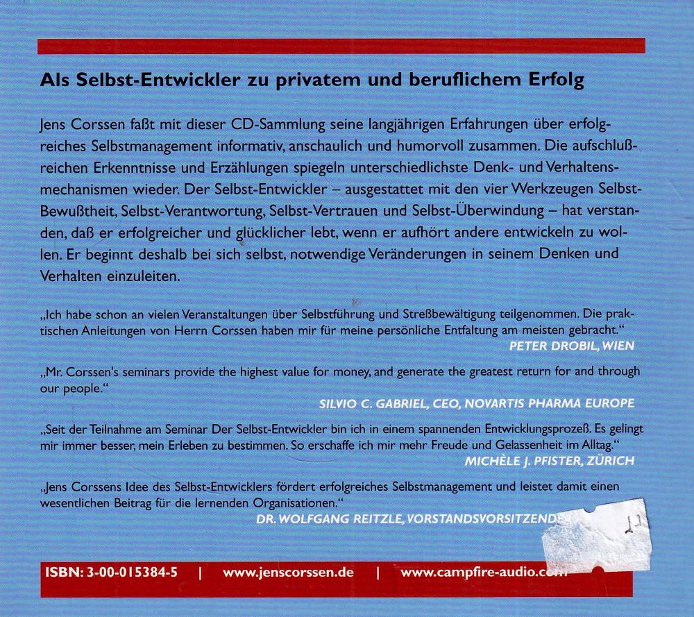 Jens Corssen fasst mit dieser CD-Sammlung seine langjährigen Erfahrungen über erfolgreiches Selbstmanagement informativ, anschaulich und humorvoll zusammen. Die aufschlussreichen Erkenntnisse und Erzählungen spiegeln unterschiedlichste Denk- und Verhaltensmechanismen wieder. Der Selbst-Entwickler = ausgestattet mit den vier Werkzeugen Selbst-Bewusstheit, Selbst-Verantwortung, Selbst-Vertrauen und Selbst-Überwindung - hat verstanden, dass er erfolgreicher und glücklicher lebt, wenn er aufhört andere entwickeln zu wollen. Er beginnt deshalb bei sich selbst, notwendige Veränderungen in seinem Denken und Verhalten einzuleiten.