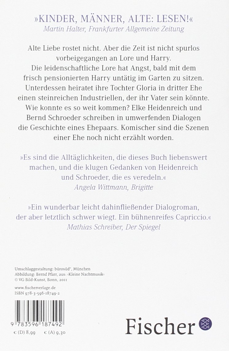 Alte Liebe rostet nicht. Aber die Zeit ist nicht spurlos vorbeigegangen an Lore und Harry. Die leidenschaftliche Lore hat Angst, bald mit dem frisch pensionierten Harry untätig im Garten zu sitzen. Unterdessen heiratet ihre Tochter Gloria in dritter Ehe einen steinreichen Industriellen, der ihr Vater sein könnte. Wie konnte es so weit kommen? Elke Heidenreich und Bernd Schroeder erzählen in umwerfenden Dialogen die Geschichte eines Ehepaars. Komischer sind die Szenen einer Ehe noch nicht erzählt worden.