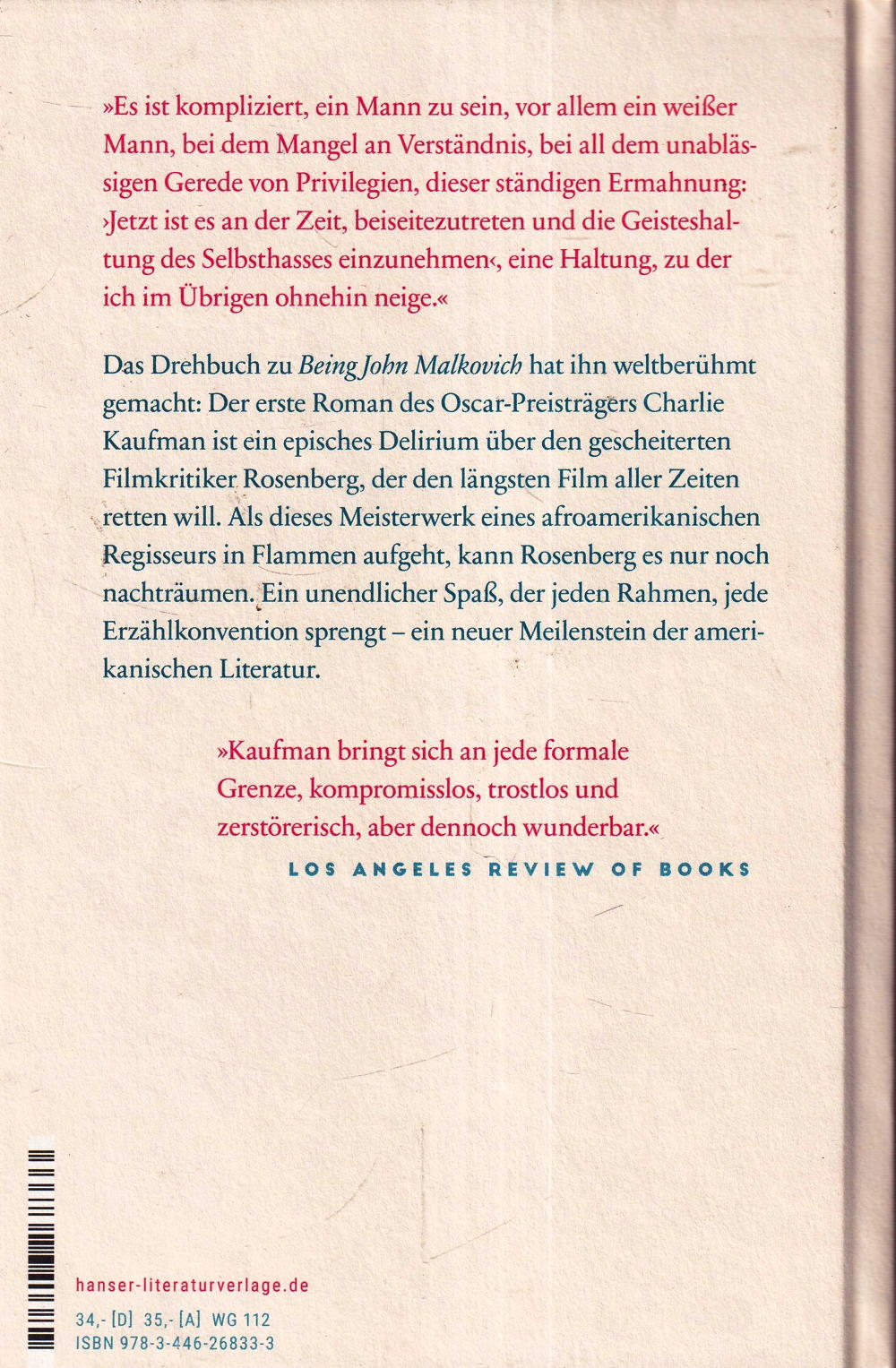 Das Drehbuch zu „Being John Malkovich“ hat Charlie Kaufman weltberühmt gemacht. Der erste Roman des Oscar-Preisträgers ist ein neuer Meilenstein der amerikanischen Literatur: B. Rosenberg kriegt nichts auf die Reihe, ausser Kritiken zu schreiben, die keiner liest. Der New Yorker Stadtneurotiker prahlt mit der schwarzen Hautfarbe seiner Freundin und wehrt sich gegen die Unterstellung, er sei Jude. Nicht einmal ein Geschlecht will er haben und nennt sich einfach nur B. Dann jedoch stösst er auf den längsten jemals gedrehten Film und hat eine Mission: Er möchte den ungesehenen Film der Welt zeigen. Doch das Meisterwerk geht in Flammen auf, und B. kann es nur nachträumen. Ein unendlicher Spass, der jeden Rahmen sprengt.