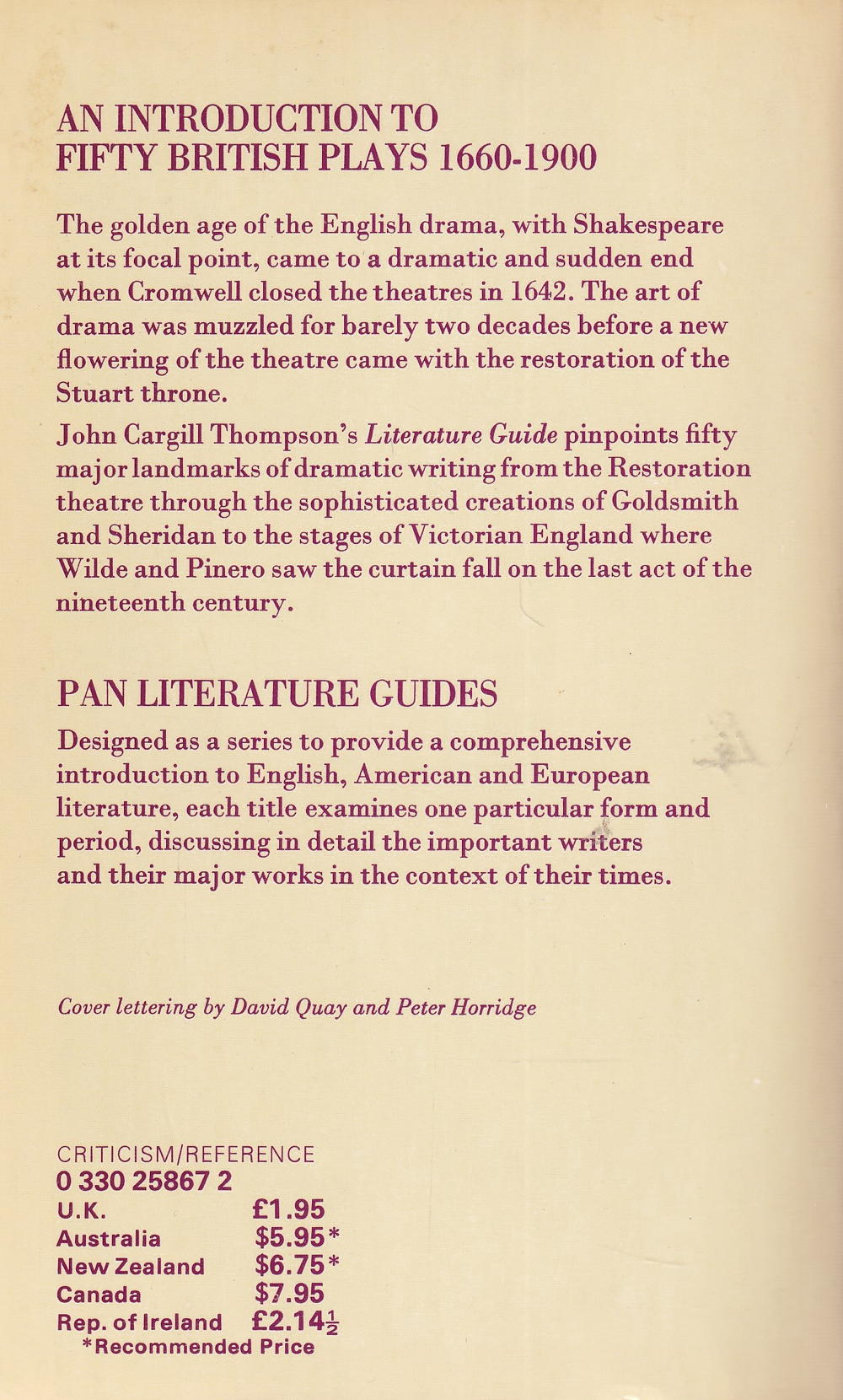 John Cargill Thompson's Literature Guide pinpoints fifty major landmarks of dramatic writing from the Restoration theatre through the sophisticated creations of Goldsmith and Sheridan to the stages of Victorian England where Wilde and Pinero saw the curtain fall on the last act of the nineteenth century.