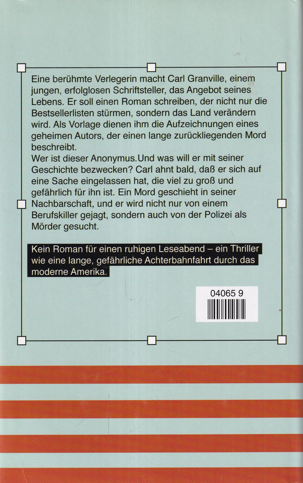 Wer ist dieser Anonymus.Und was will er mit seiner Geschichte bezwecken? Carl ahnt bald, dass er sich auf eine Sache eingelassen hat, die viel zu gross und gefährlich für ihn ist. Ein Mord geschieht in seiner Nachbarschaft, und er wird nicht nur von einem Berufskiller gejagt, sondern auch von der Polizei als Mörder gesucht.