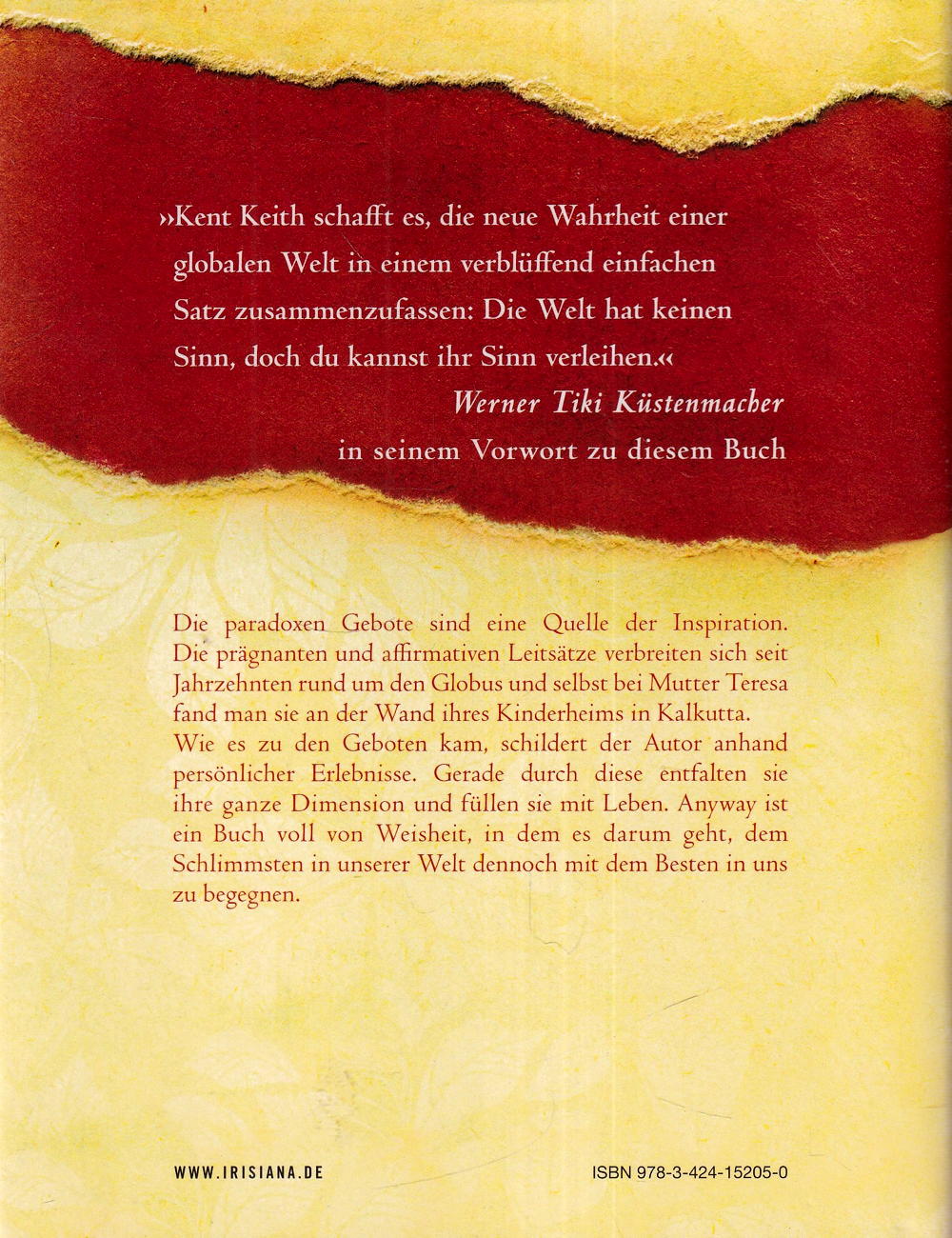 Ursprünglich formulierte Kent M. Keith 1968 die zehn paradoxen Gebote als Student. Rasch zeigte es sich, dass sie für viele ausgesprochen inspirierend waren. Die prägnanten und affirmativen Leitsätze verbreiteten sich rund um den Globus und selbst bei Mutter Teresa fand man sie an die Wand ihres Kinderheims in Kalkutta gepinnt. Und so schrieb Kent M. Keith dieses Buch, in dem er die Geschichten und Ideen erzählt, die hinter jedem Gebot stehen und was es bedeutet, nach ihnen zu leben. Die Erläuterungen, Merksätze und Fallbeispiele veranschaulichen die Gebote, machen sie praktisch erfahrbar und füllen sie mit Leben. Das Buch berührte Abertausende. Es wurde ein Bestseller und in 17 Sprachen übersetzt. Erstmals erscheint »Anyway« nun auf Deutsch.