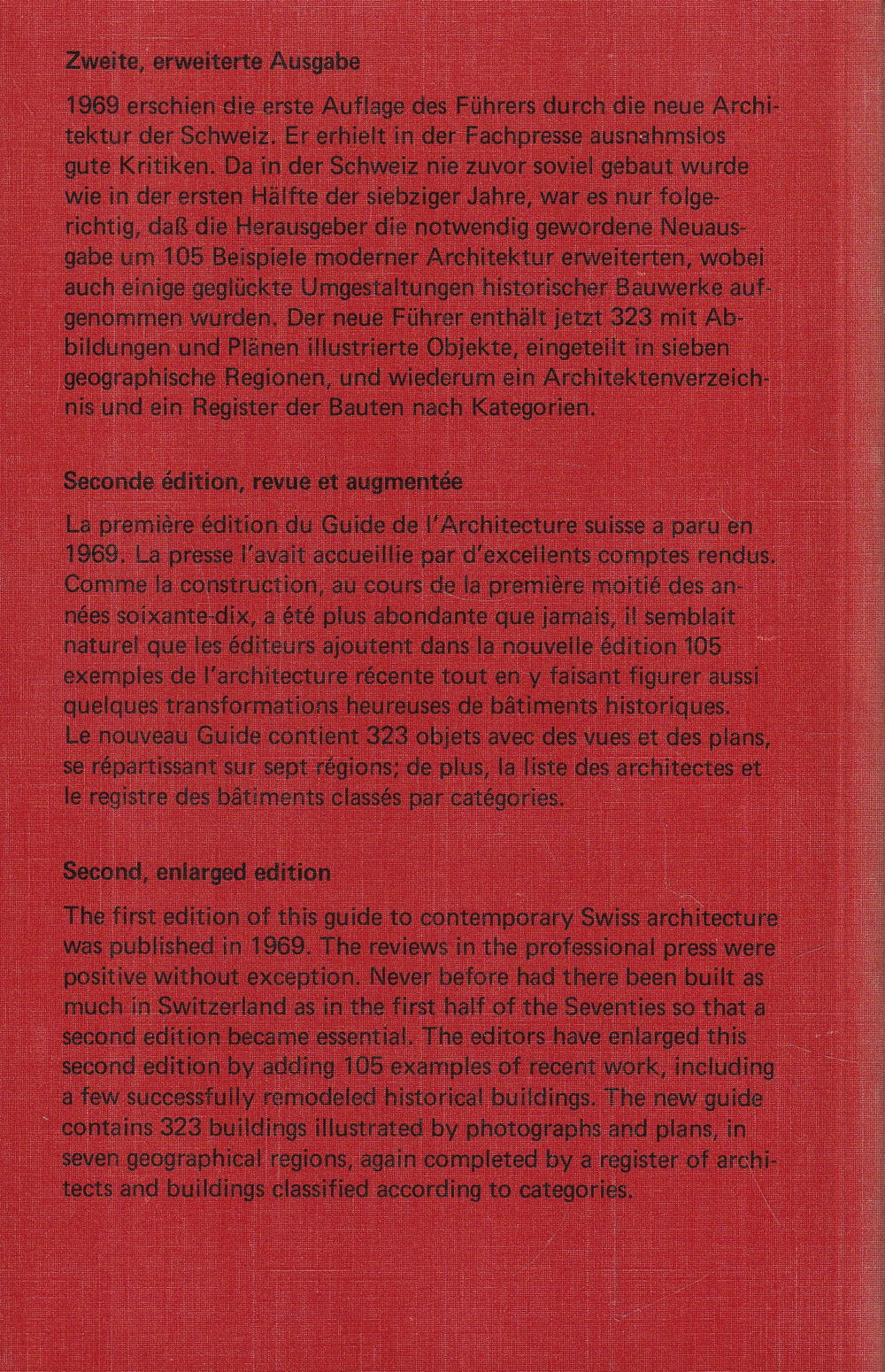 Zweite, erweiterte Ausgabe 1969 erschien die erste Auflage des Führers durch die neue Architektur der Schweiz. Er erhielt in der Fachpresse ausnahmslos gute Kritiken. Da in der Schweiz nie zuvor soviel gebaut wurde wie in der ersten Halfte der siebziger Jahre, war es nur folge richtig, dass die Herausgeber die notwendig gewordene Neuausgabe um 105 Beispiele moderner Architektur erweiterten, wobei auch einige geglückte Umgestaltungen historischer Bauwerke auf, genommen wurden. Der neue Führer enthält jetzt 323 mit Abbildungen und Plänen illustrierte Objekte, eingeteilt in sieben geographische Regionen, und wiederum ein Architektenverzeich nis und ein Register der Bauten nach Kategorien.