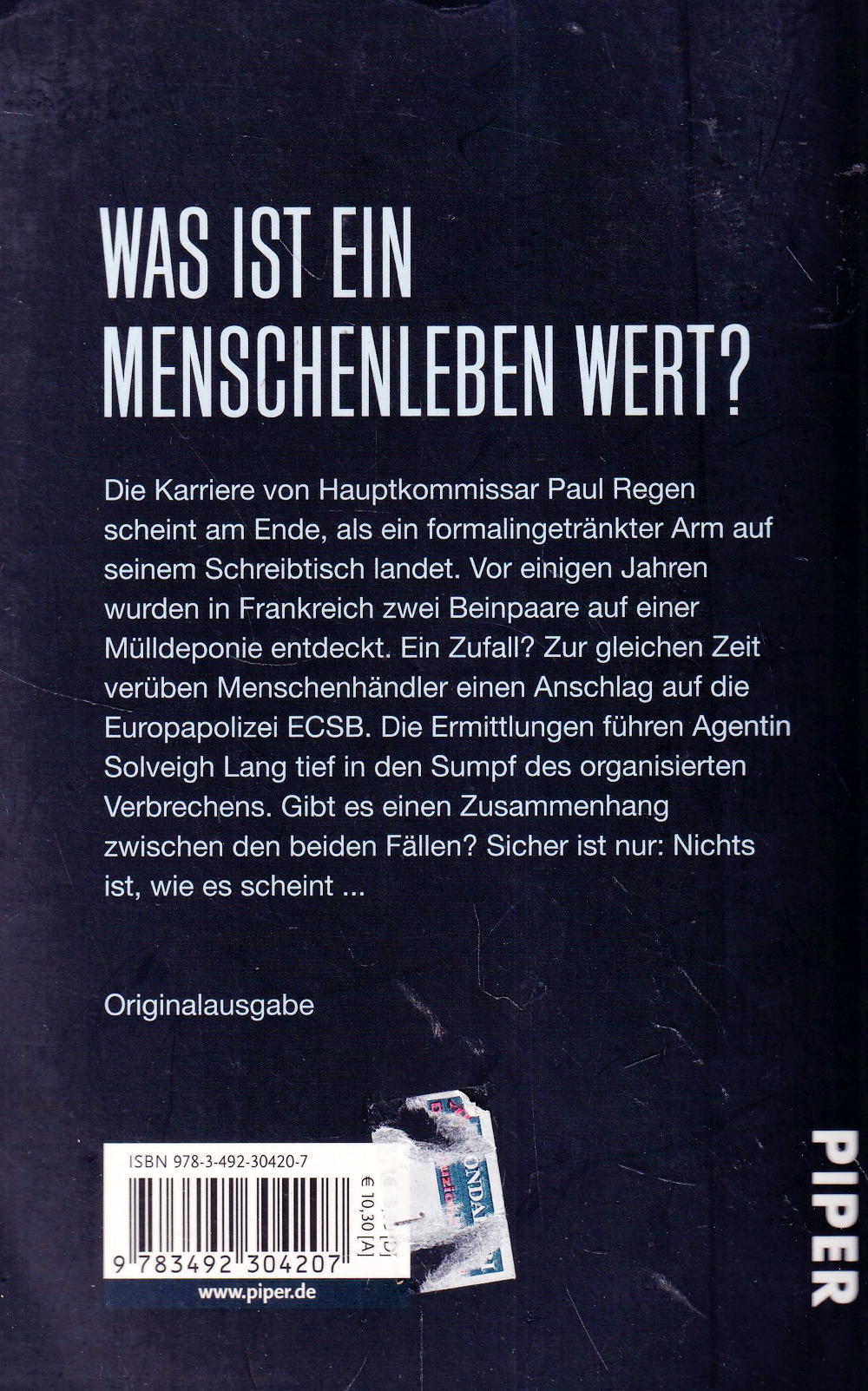 Die Karriere von Hauptkommissar Paul Regen scheint am Ende, als ein formalingetränkter Arm auf seinem Schreibtisch landet. Vor einigen Jahren wurden in Frankreich zwei Beinpaare auf einer Mülldeponie entdeckt. Ein Zufall? Zur gleichen Zeit verüben Menschenhändler einen Anschlag auf die Europapolizei ECSB. Die Ermittlungen führen Agentin Solveigh Lang tief in den Sumpf des organisierten Verbrechens. Gibt es einen Zusammenhang zwischen den beiden Fällen? Sicher ist nur: Nichts ist, wie es scheint...