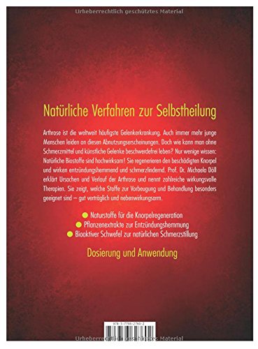 Natürliche Verfahren zur Selbstheilung: Arthrose ist die weltweit häufigste Gelenkerkrankung. Auch immer mehr junge Menschen leiden an diesen Abnutzungserscheinungen und fragen sich: Wie kann ich ohne Schmerzmittel und künstliche Gelenke beschwerdefrei leben? Nur wenige wissen: Natürliche Biostoffe sind hoch wirksam! Sie regenerieren den beschädigten Knorpel und wirken entzündungshemmend und schmerzlindernd. Prof. Dr. Michaela Döll zeigt, welche Stoffe zur Vorbeugung und Behandlung besonders geeignet sind - gut verträglich und nebenwirkungsarm. Ein fundierter Ratgeber zu den Ursachen, dem Verlauf der Arthrose und mit zahlreichen wirkungsvollen Therapien.