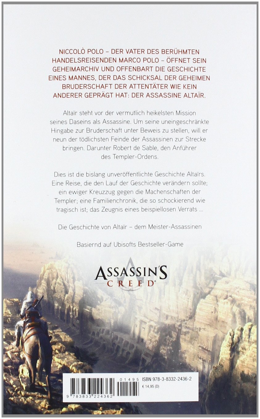 Altaïr steht vor der vermutlich heikelsten Mission seines Daseins als Assassine. Um seine uneingeschränkte Hingabe zur Bruderschaft unter Beweis zu stellen, will er neun der tödlichsten Feinde der Assassinen zur Strecke bringen. Darunter Robert de Sable, den Anführer des Templer-Ordens. Dies ist die bislang unveröffentlichte Geschichte Altaïrs. Eine Reise, die den Lauf der Geschichte verändern sollte; ein ewiger Kreuzzug gegen die Machenschaften der Templer; eine Familienchronik, die so schockierend wie tragisch ist; das Zeugnis eines beispiellosen Verrats ... Die Geschichte von Altaïr - dem Meister-Assassinen Basiernd auf Ubisofts Bestseller-Game.