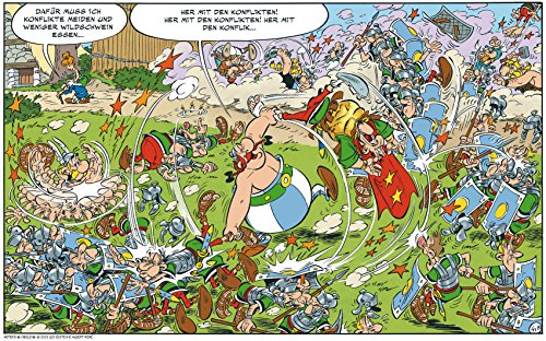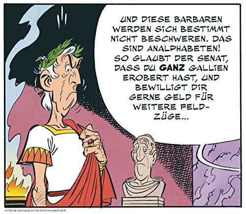 DIE GALLIER sind wieder da! Und nicht nur die Gallier, sondern auch der gute alte Julius (Cäsar) – seines Zeichens grösster Feldherr aller Zeiten und neuerdings auch Schriftsteller... Ja, der grosse Feldherr Julius Cäsar hat ein Buch geschrieben – und zwar kein geringeres als den Latein-Klassiker Der Gallische Krieg/ De bello Gallico. Auf Drängen seines Verlegers und PR-Beraters Syndicus unterschlägt er darin allerdings ein nicht ganz unwesentliches Kapitel der gallischen Geschichte. Nämlich jenes, das von den unbeugsamen Galliern handelt. Cäsar behauptet, ganz Gallien besiegt zu haben und das können unsere gallischen Freunde Asterix, Obelix & Co. natürlich nicht auf sich sitzen lassen. So entbrennt die vermutlich erste PR-Schlacht der Geschichte: eine Schlacht voll hintergründigem Witz und mit grosser Spannung, jeder Menge verkloppter Römer – und verspeister Wildschweine? Lassen Sie sich überraschen!