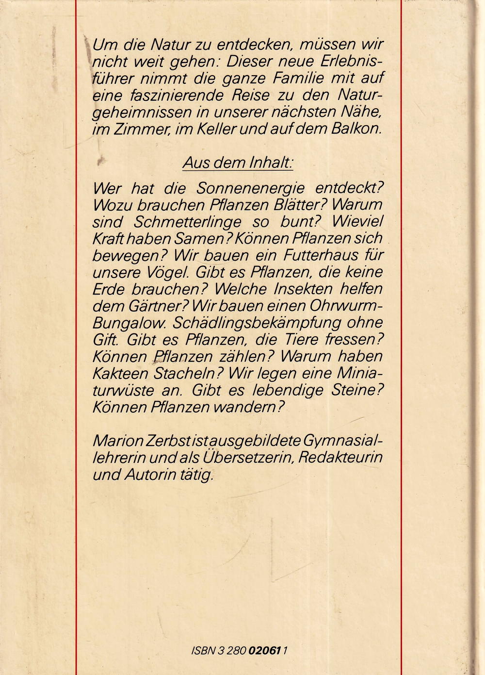 Wozu brauchen Pflanzen Blätter? Warum sind Schmetterlinge so bunt? Wieviel Kraft haben Samen? Können Pflanzen sich bewegen? Wir bauen ein Futterhaus für unsere Vögel. Gibt es Pflanzen, die keine Erde brauchen? Welche Insekten helfen dem Gärtner? Wir bauen einen Ohrwurm-Bungalow. Schädlingsbekämpfung ohne Gift. Gibt es Pflanzen, die Tiere fressen?
