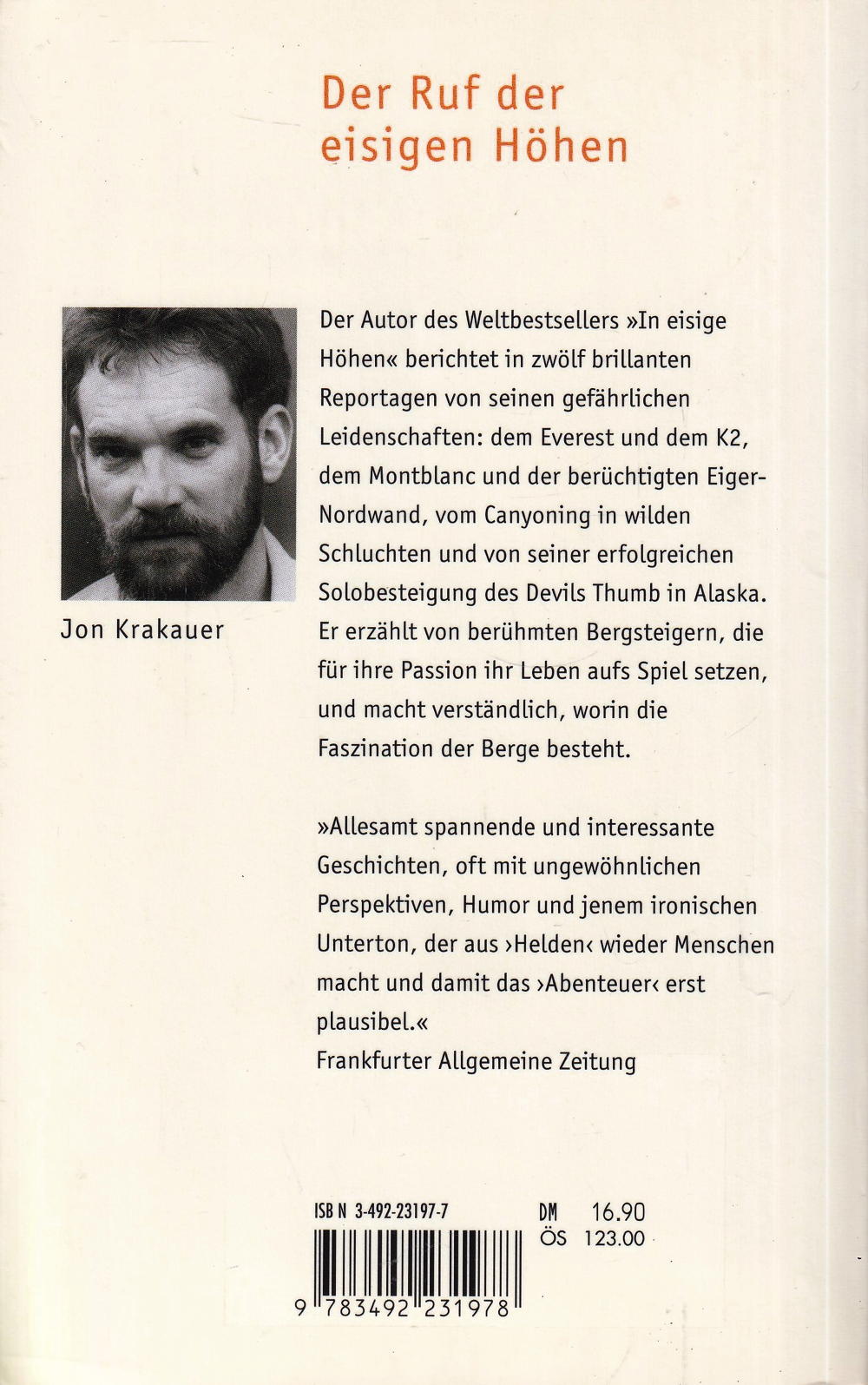 Die Eiger-Nordwand und andere Träume. Der Autor des Weltbestellers »In eisige Höhen« berichtet in zwölf brillanten Reportagen von seinen gefährlichen Leidenschaften: dem Mount Everest und dem K2, dem Montblanc und der berüchtigten Eiger-Nordwand, vom Canyoning in wilden Schluchten und von seiner erfolgreichen Solobesteigung des Devils Thumb in Alaska. Er erzählt von berühmten Bergsteigern, die für ihre Passion ihr Leben aufs Spiel setzen, und macht verständlich, worin die Faszination der Berge besteht.