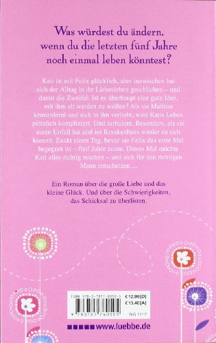 Kati ist mit Felix glücklich, aber nach fünf Jahren hat sich der Alltag in ihr Liebesleben geschlichen – und damit die Zweifel: Ist es überhaupt eine gute Idee, mit ihm alt werden zu wollen? Als sie Mathias kennen lernt und sich in ihn verliebt, wird Katis Leben plötzlich kompliziert. Und turbulent. Besonders, als sie von einer Strassenbahn erfasst wird und im Krankenhaus wieder zu sich kommt. Exakt einen Tag, bevor sie Felix das erste Mal begegnet ist – fünf Jahre zuvor. Würden Sie alles genauso machen, wenn Sie die letzten fünf Jahre noch einmal leben könnten? Was würden Sie ändern?