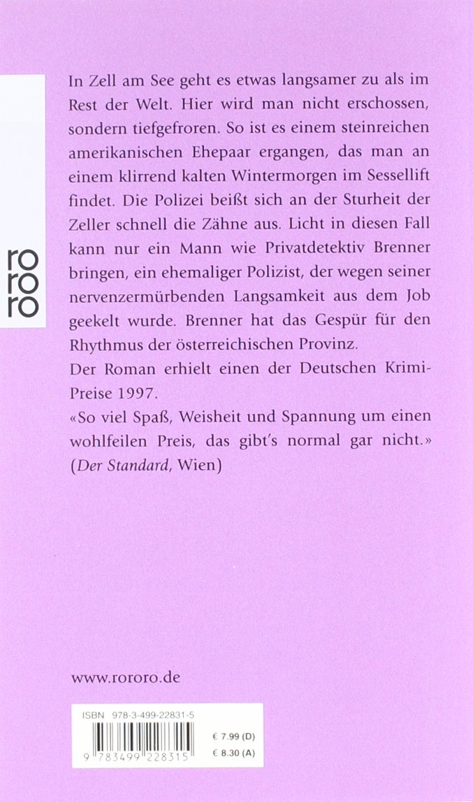In Zell am See geht es etwas langsamer zu als im Rest der Welt. Hier wird man nicht erschossen., sondern tiefgefroren. So ist es einem steinreichen amerikanischen Ehepaar ergangen, das man an einem klirrend kalten Wintermorgen in einem Sessellift findet. Die Polizei beißt sich an der Sturheit der Zeller schnell die Zähne aus. Licht in diesen Fall kann nur ein Mann wie Privatdetektiv Brenner bringen, ein ehemaliger Polizist, der wegen seiner nervenzermürbenden Langsamkeit aus dem Job geekelt wurde. Brenner hat das Gespür für den
