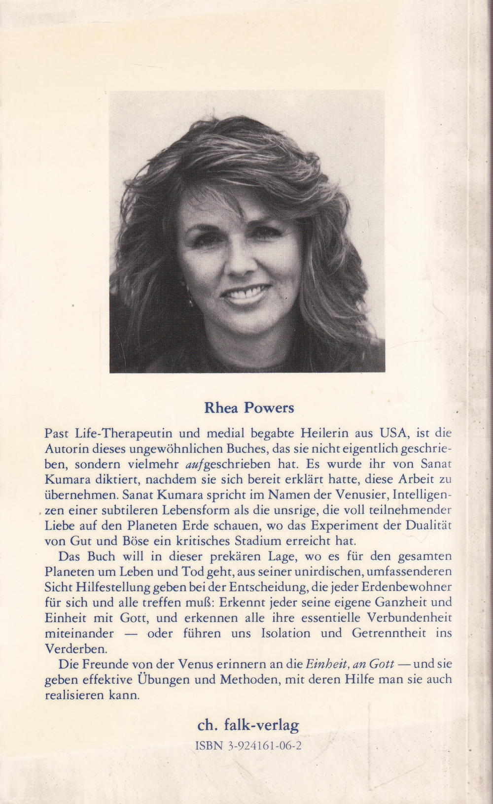 Rhea Powers Past Life-Therapeutin und medial begabte Heilerin aus USA, ist die Autorin dieses ungewöhnlichen Buches, das sie nicht eigentlich geschrieben, sondern vielmehr aufgeschrieben hat. Es wurde ihr von Sanat Kumara diktiert, nachdem sie sich bereit erklärt hatte, diese Arbeit zu übernehmen. Sanat Kumara spricht im Namen der Venusier, Intelligenzen einer subtileren Lebensform als die unsrige, die voll teilnehmender Liebe auf den Planeten Erde schauen, wo das Experiment der Dualität von Gut und Böse ein kritisches Stadium erreicht hat.