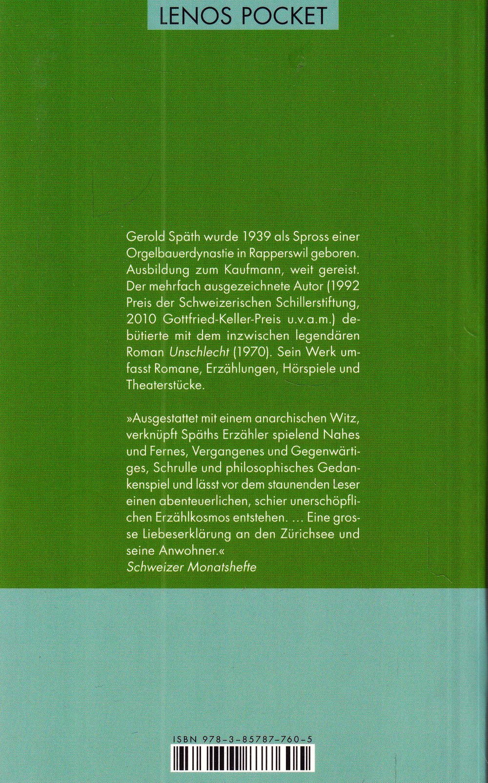 Gerold Späth wurde 1939 als Spross einer Orgelbauerdynastie in Rapperswil am oberen Zürichsee geboren. Nach seiner Ausbildung zum Kaufmann reiste er weit herum. 1968 begann er mit dem Schreiben, arbeitete allerdings noch bis 1975 im väterlichen Orgelbaubetrieb mit. Er wurde mehrfach ausgezeichnet und erhielt u. a. den Alfred-Döblin-Preis (1979), den Preis der Schweizerischen Schillerstiftung (1992) und den Gottfried-Keller-Preis (2010). Heute lebt er mit seiner Familie in Italien, Irland und Rapperswil.