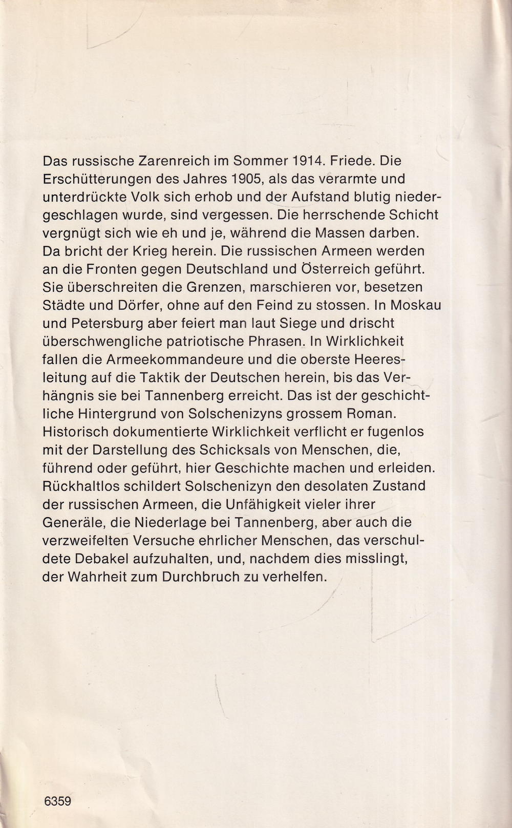 Sie überschreiten die Grenzen, marschieren vor, besetzen Städte und Dörfer, ohne auf den Feind zu stossen. In Moskau und Petersburg aber feiert man laut Siege und drischt überschwengliche patriotische Phrasen. In Wirklichkeit fallen die Armeekommandeure und die oberste Heeresleitung auf die Taktik der Deutschen herein, bis das Verhängnis sie bei Tannenberg erreicht. Das ist der geschichtliche Hintergrund von Solschenizyns grossem Roman.