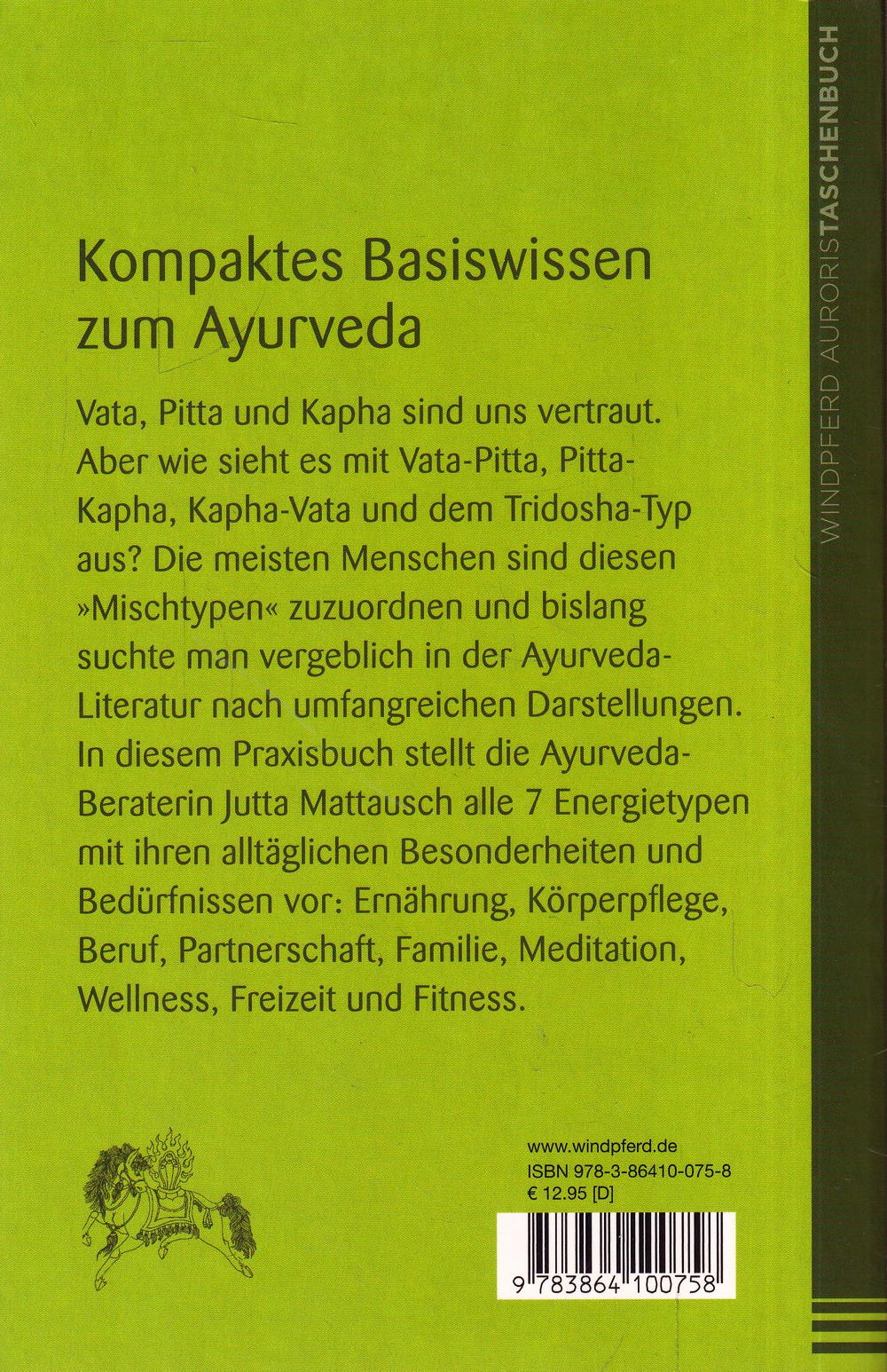 Vata, Pitta und Kapha sind uns vertraut. Aber wie sieht es mit Vata-Pitta, Pitta-Kapha, Kapha-Vata und dem Tridosha-Typ aus? Die meisten Menschen sind diesen Mischtypen zuzuordnen und bislang suchte man vergeblich in der Ayurveda-Literatur nach umfangreichen Darstellungen. In diesem Praxisbuch stellt die Ayurveda-Beraterin Jutta Mattausch alle sieben Energietypen mit ihren alltäglichen Besonderheiten und Bedürfnissen vor: Ernährung, Körperpflege, Beruf, Partnerschaft, Familie, Meditation, Wellness, Freizeit und Fitness.
