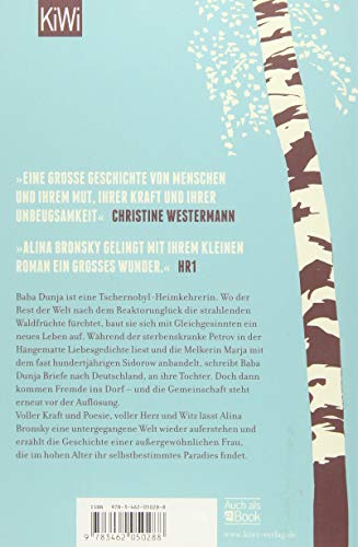 Christine Westermann Baba Dunja ist eine Tschernobyl-Heimkehrerin. Wo der Rest der Welt nach dem Reaktorunglück die strahlenden Waldfrüchte fürchtet, baut sie sich mit Gleichgesinnten ein neues Leben auf. Mitten im Niemandsland, wo die Vögel so laut rufen wie nirgends sonst und manchmal ein Toter auf einen Plausch vorbeikommt. Während der sterbenskranke Petrov in der Hängematte Liebesgedichte liest und die Melkerin Marja mit dem fast hundertjährigen Sidorow anbandelt, schreibt Baba Dunja Briefe nach Deutschland, an ihre Tochter. Doch dann kommen Fremde ins Dorf – und die Gemeinschaft steht erneut vor der Auflösung.